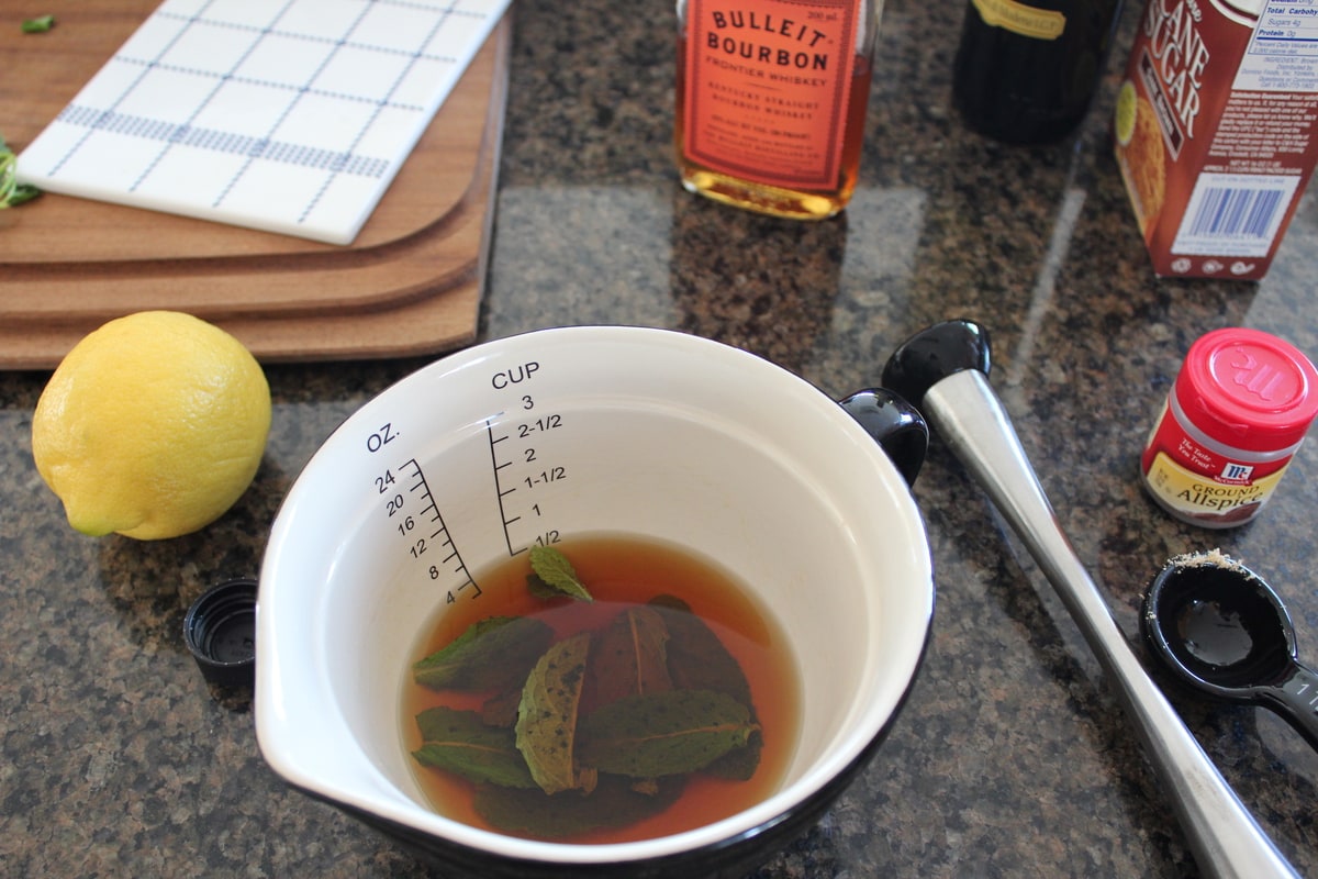 - Begin by adding the bourbon to a small mixing bowl, then add the brown sugar and 2 tbsp mint. Muddle the mint and sugar with the bourbon.