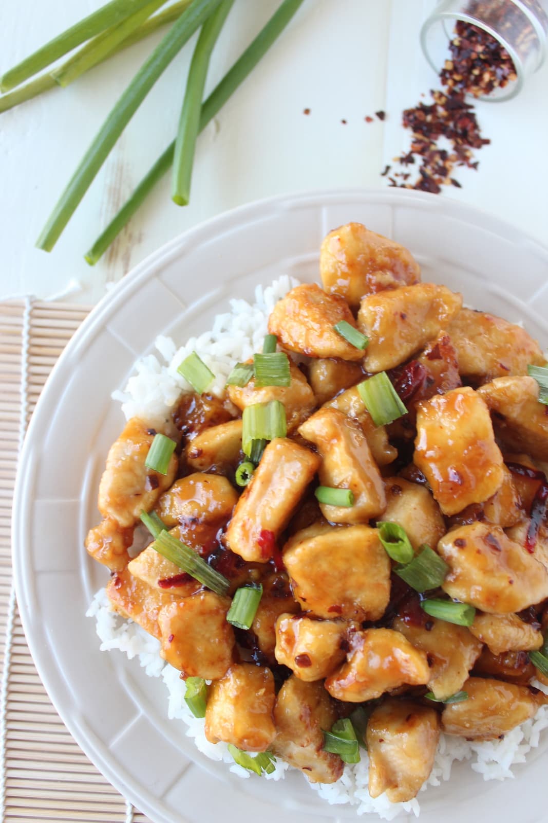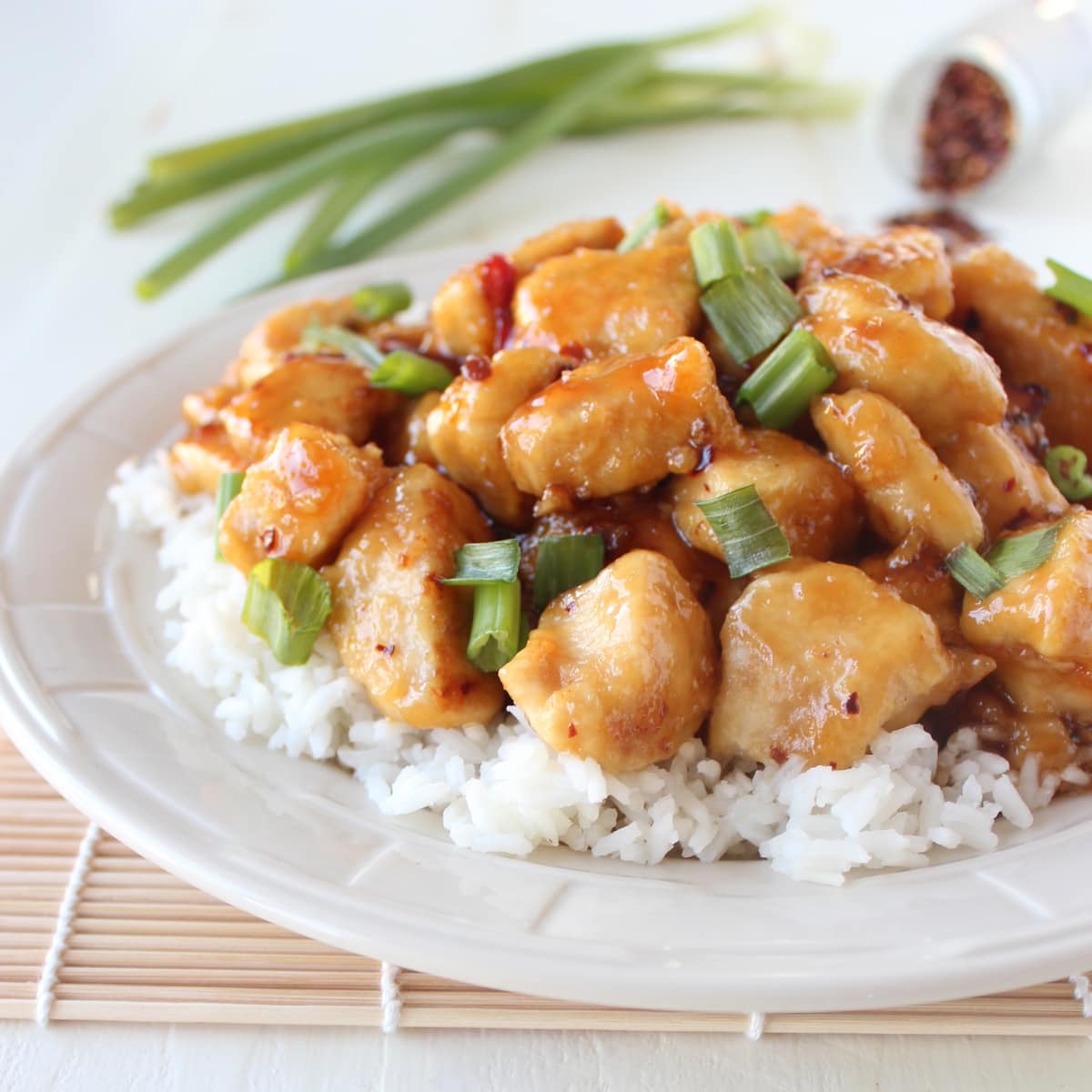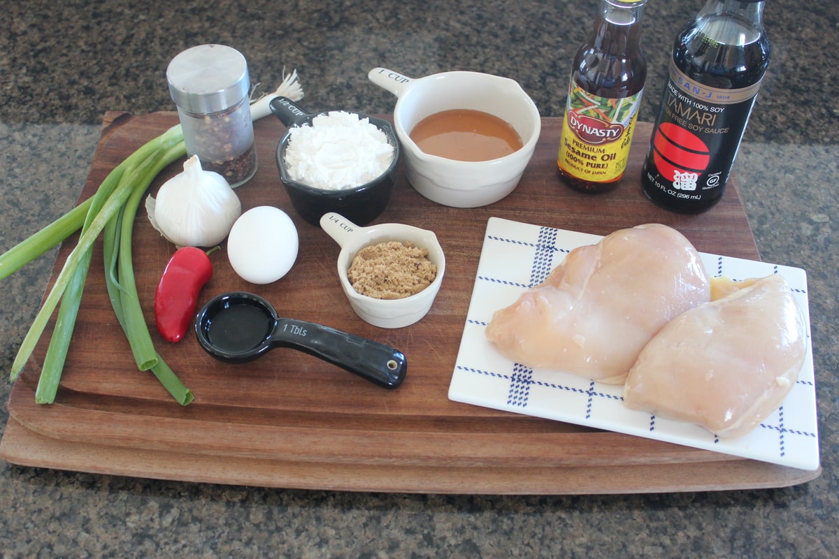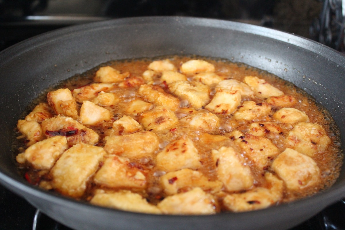 His wish is my command! Today I introduce Gluten Free Chinese Honey Chicken! It’s very lightly pan fried in olive oil, instead of deep fried and lightly battered in cornstarch, making it a healthier, lighter, and of course, gluten-free version of the Chinese Honey Chicken you’ll get from your local takeout!