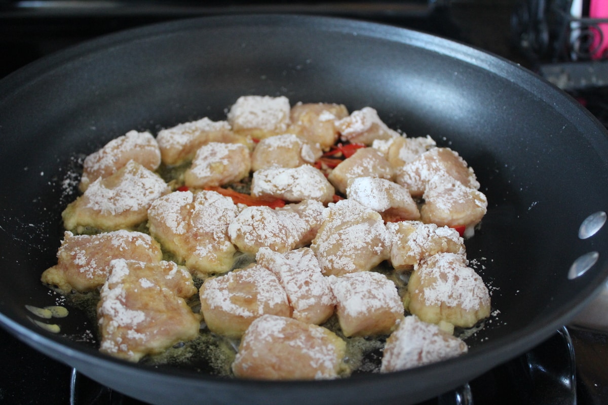 - Saute 1-2 minutes, then add the coated chicken.