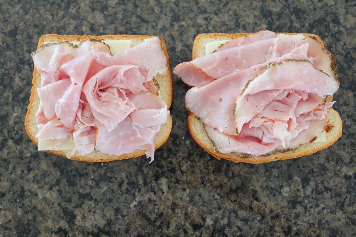 - Place one slice of cheese on each slice of bread, then top with the ham.