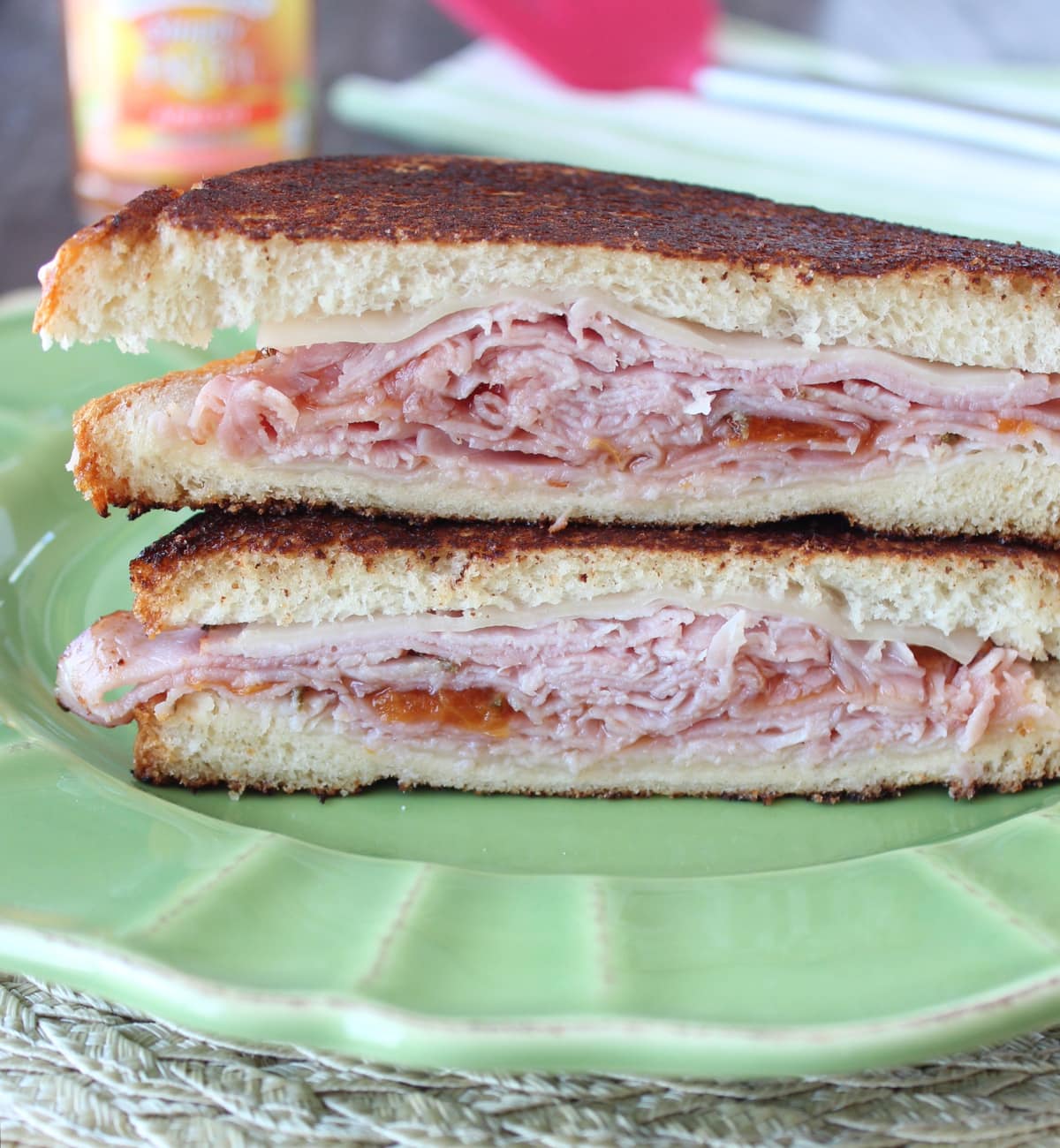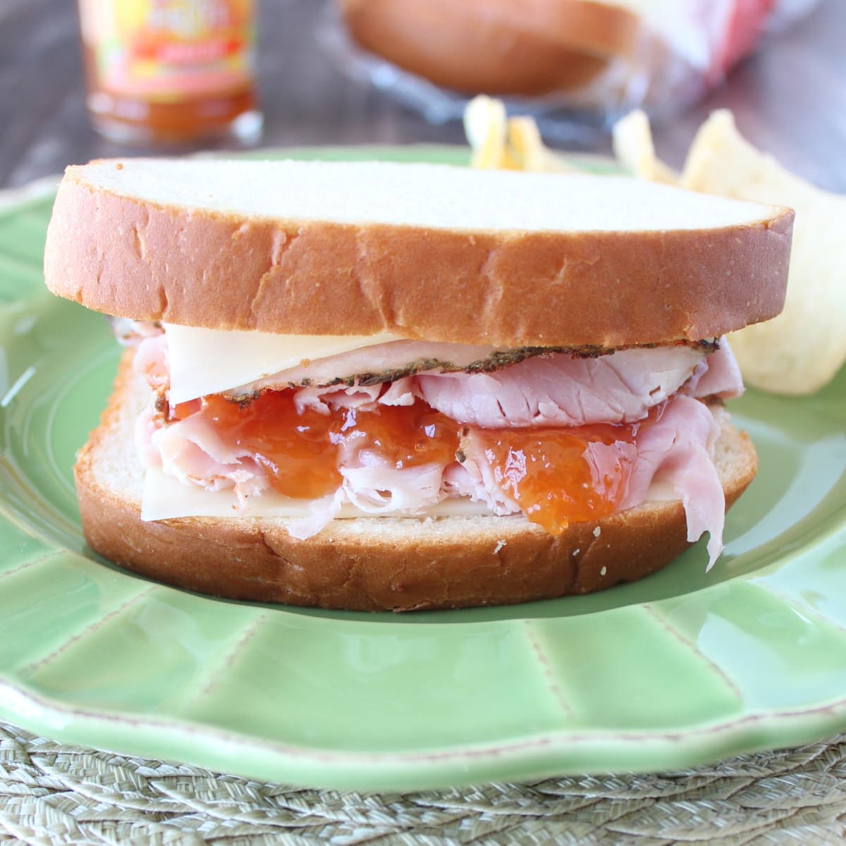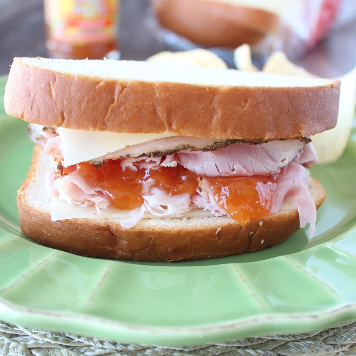 This ham and cheese sandwich recipe is given a sweet twist with apricot preserves and sweet Hawaiian sliced bread, perfect for an easy lunch!