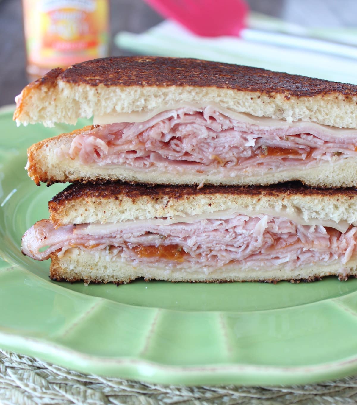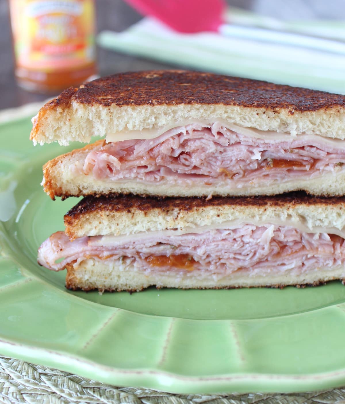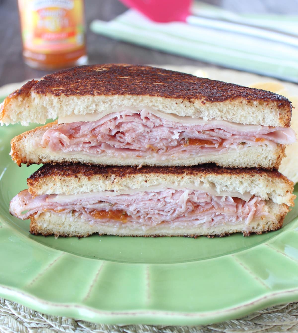 This ham and cheese sandwich recipe is given a sweet twist with apricot preserves and sweet Hawaiian sliced bread, perfect for an easy lunch!