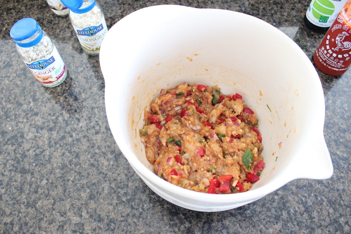 - In a large bowl, combine the ground chicken, onion, bell pepper, serrano chili and green onion.