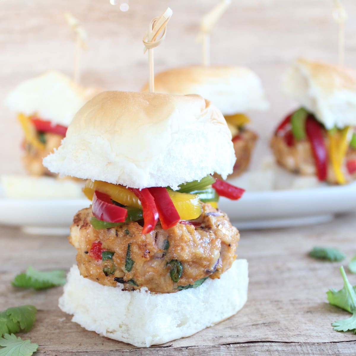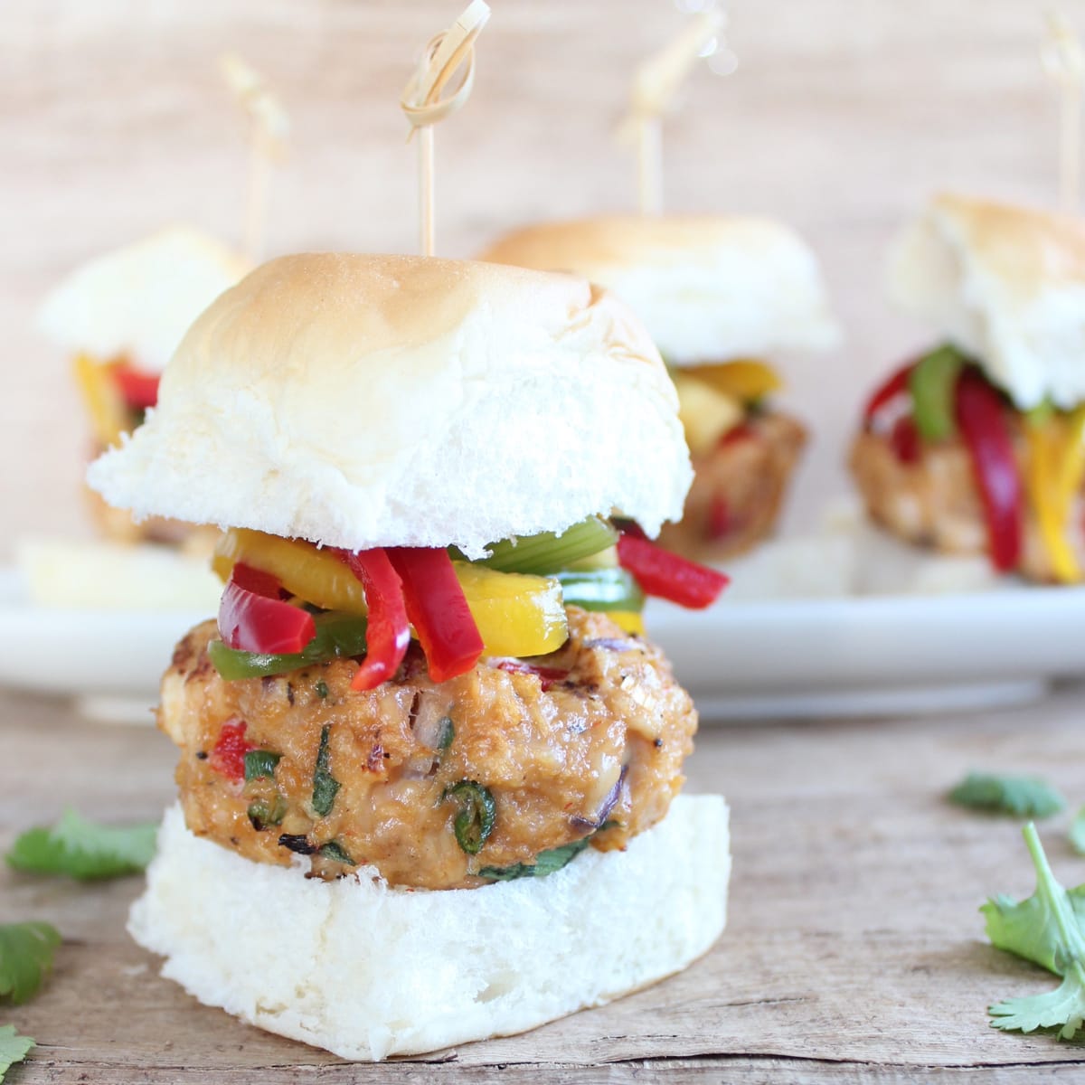 I placed mine on Hawaiian Rolls (they’re my go-to slider buns) then topped them with a Bell Pepper Pineapple Slaw.