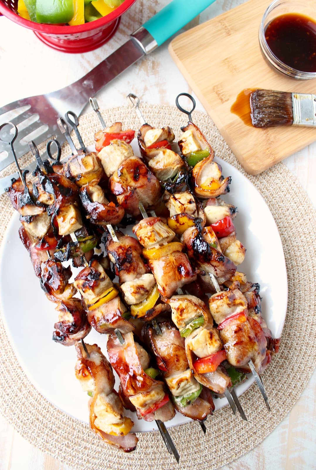 Chicken and peppers are wrapped in bacon, grilled and basted with a homemade teriyaki sauce in this simple, scrumptious recipe for Teriyaki Chicken Skewers!