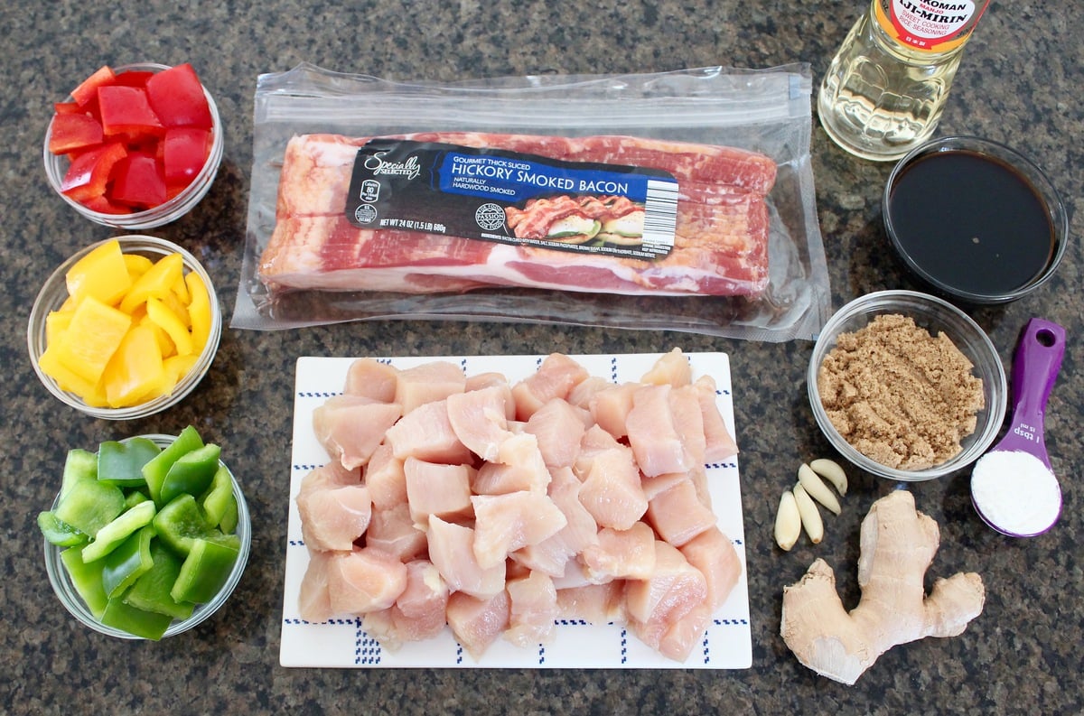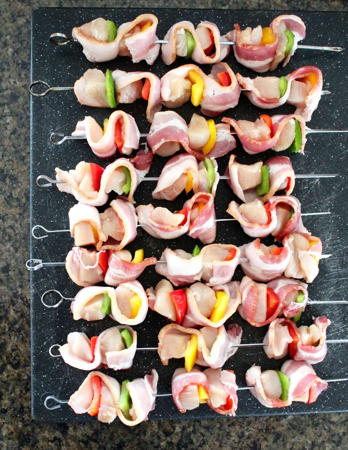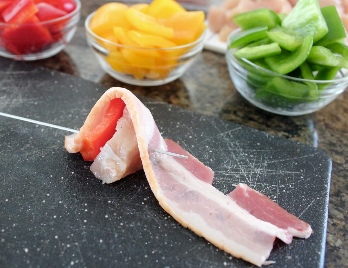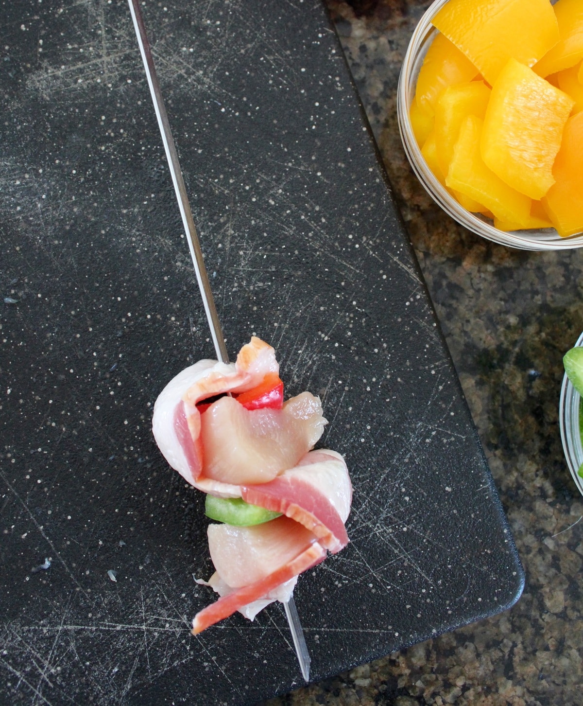 - Prepare the skewers by placing the end of one piece of bacon on a skewer, then add a piece of chicken and bell pepper, then wrap the bacon around the chicken and pepper and skewer the middle of the bacon.