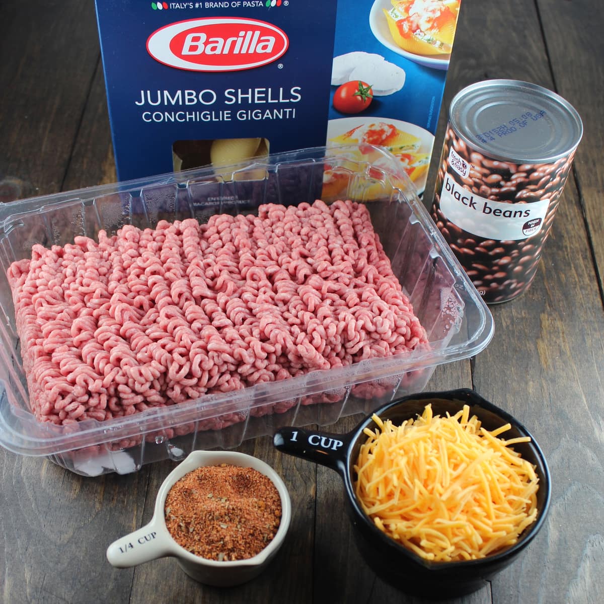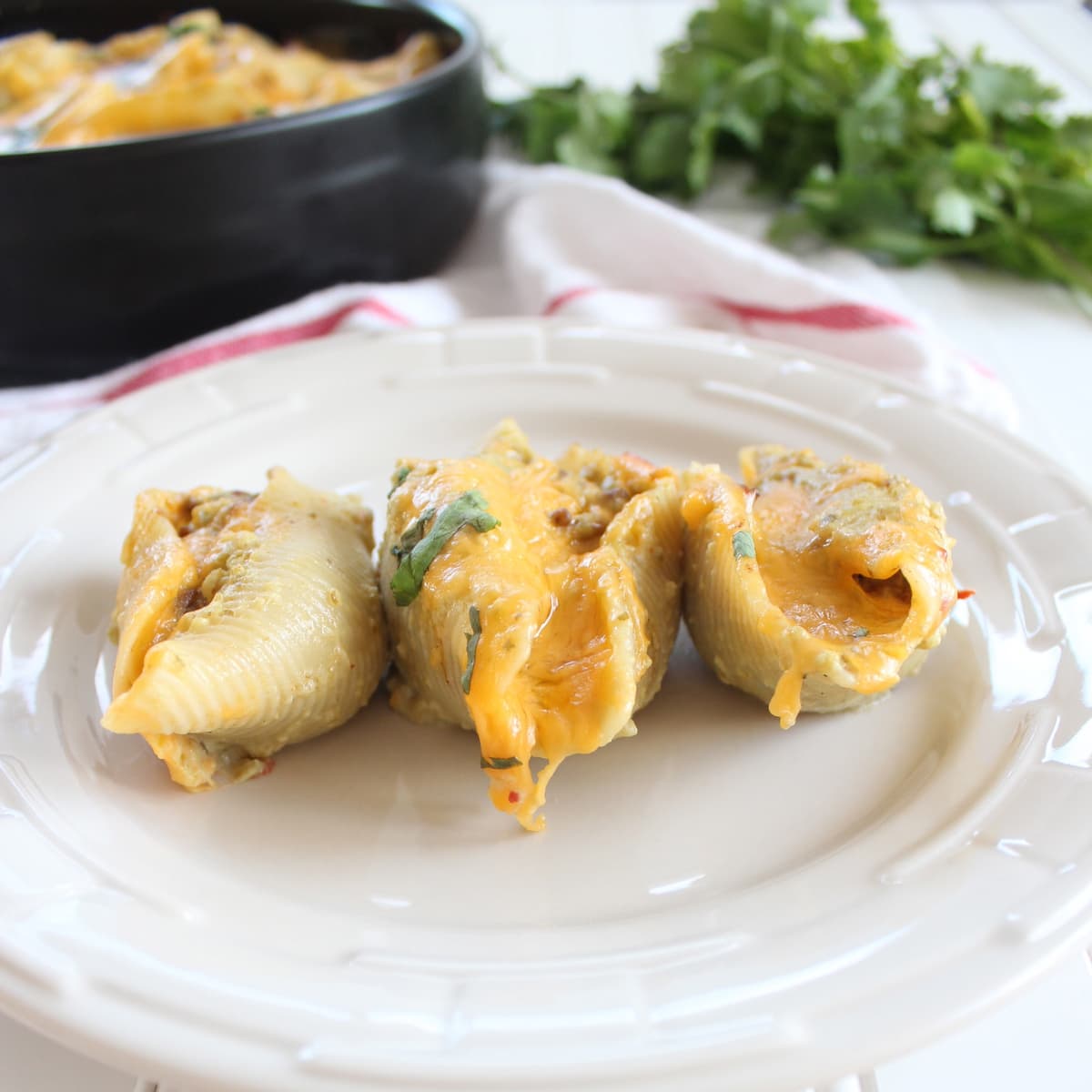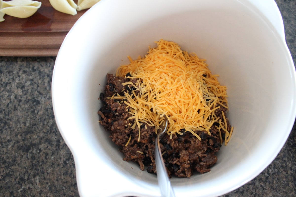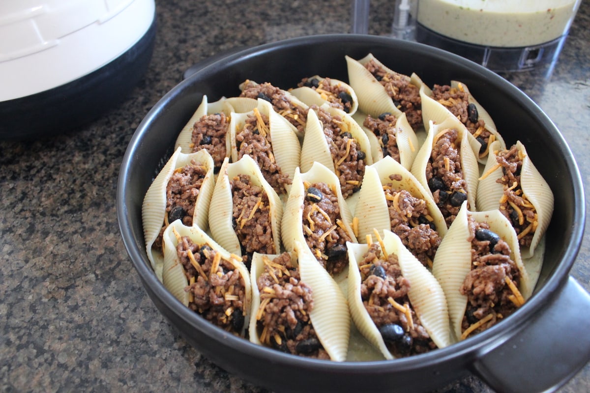 I gave the traditional Italian dish, stuffed shells, a Mexican twist by stuffing them with taco seasoned ground beef, black beans and cheese.