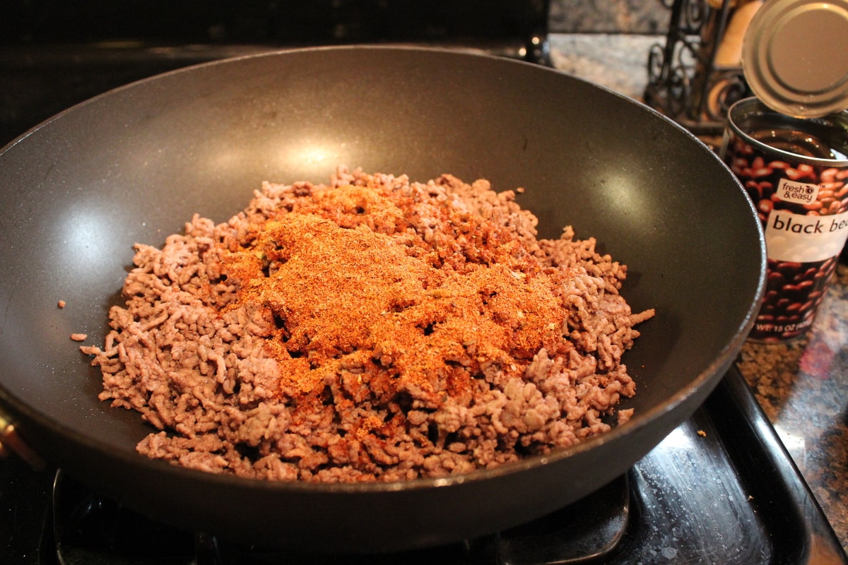 - Once the beef is cooked, drain any grease, then add the taco seasoning.