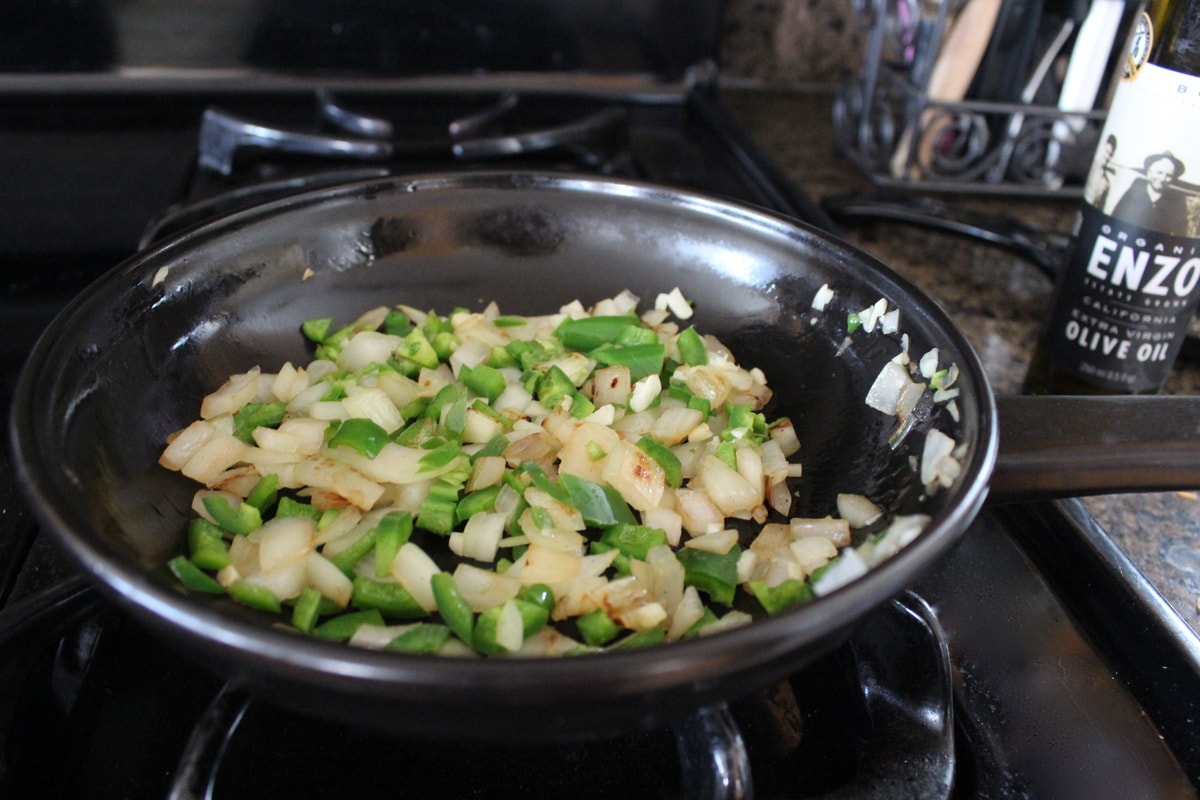 To prepare the sauce, heat the olive oil in a small skillet over medium heat. Add the garlic, onions, jalapeño and Serrano chili.