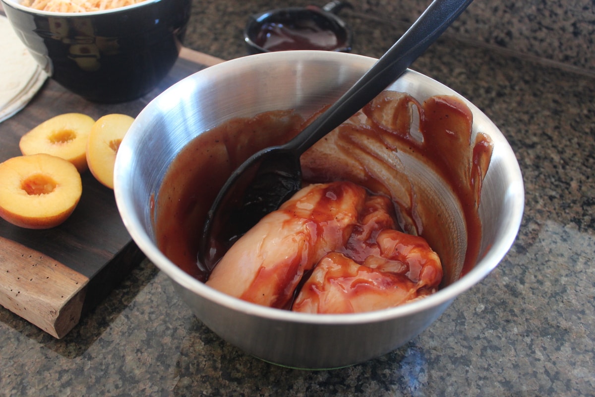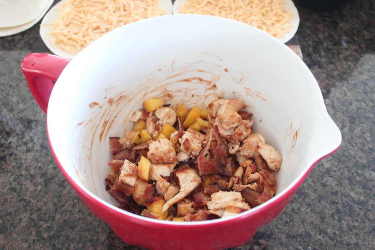 - Combine the diced peaches, chicken and bacon in a large bowl with ¼ cup BBQ sauce.