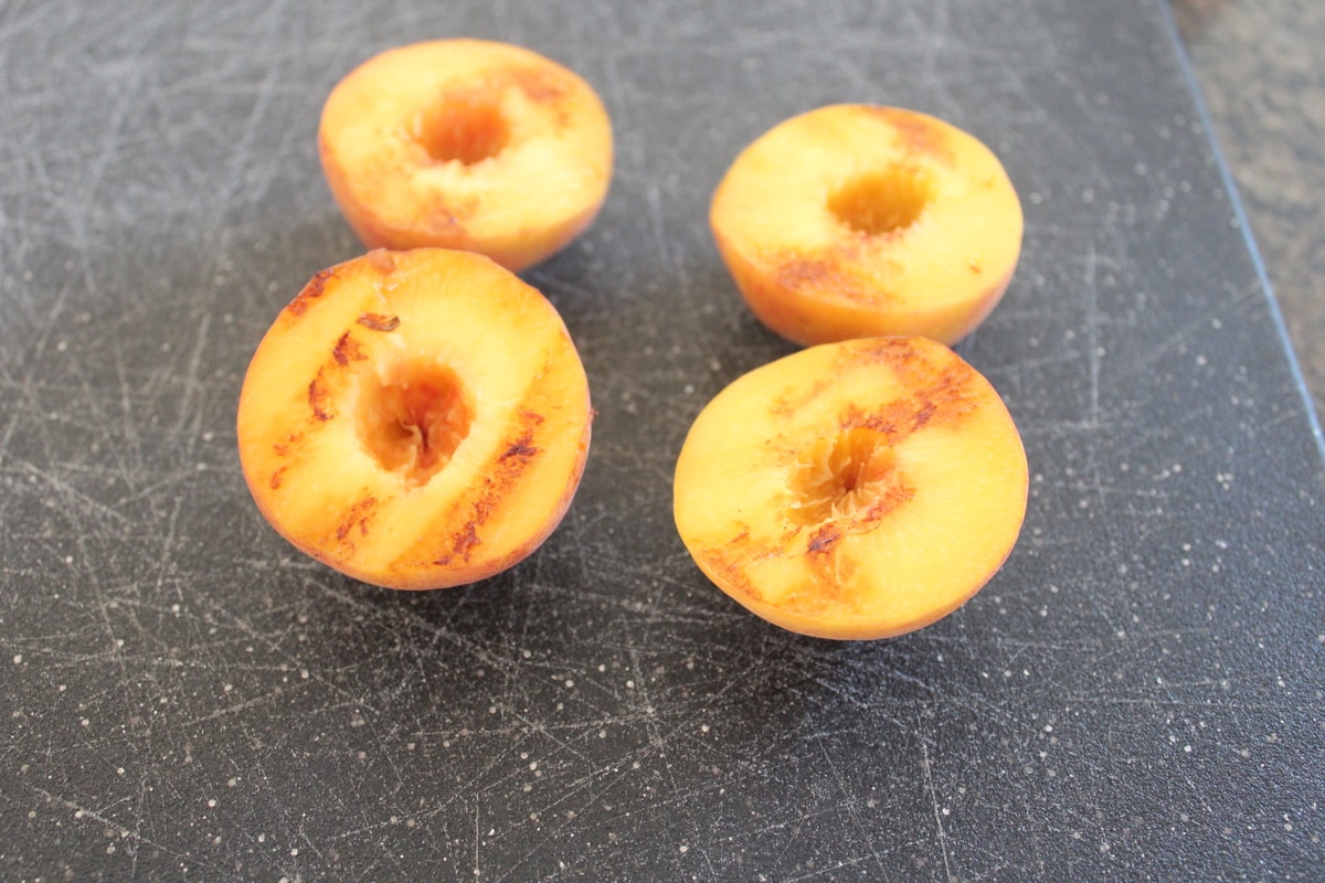 - Slice the peaches in half, remove the pit and grill the peaches skin side up for 3-4 minutes.