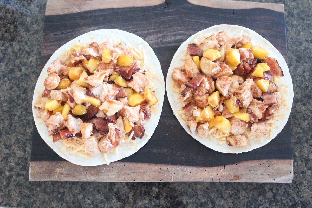 - Lay two of the tortillas on a flat surface, cover each tortilla in app. ½ cup cheese, then top with the BBQ chicken, bacon and peaches.