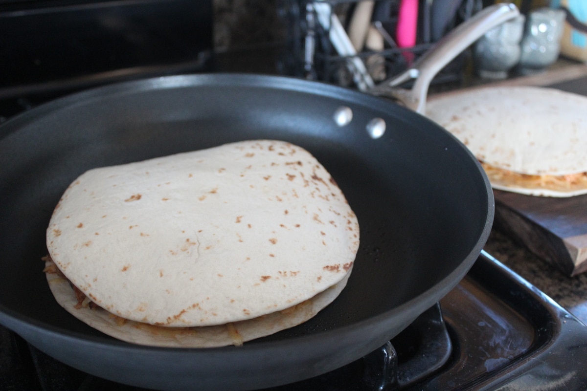 - Place another tortilla on top and cook in a large skillet over medium high heat for 5-6 minutes per side.