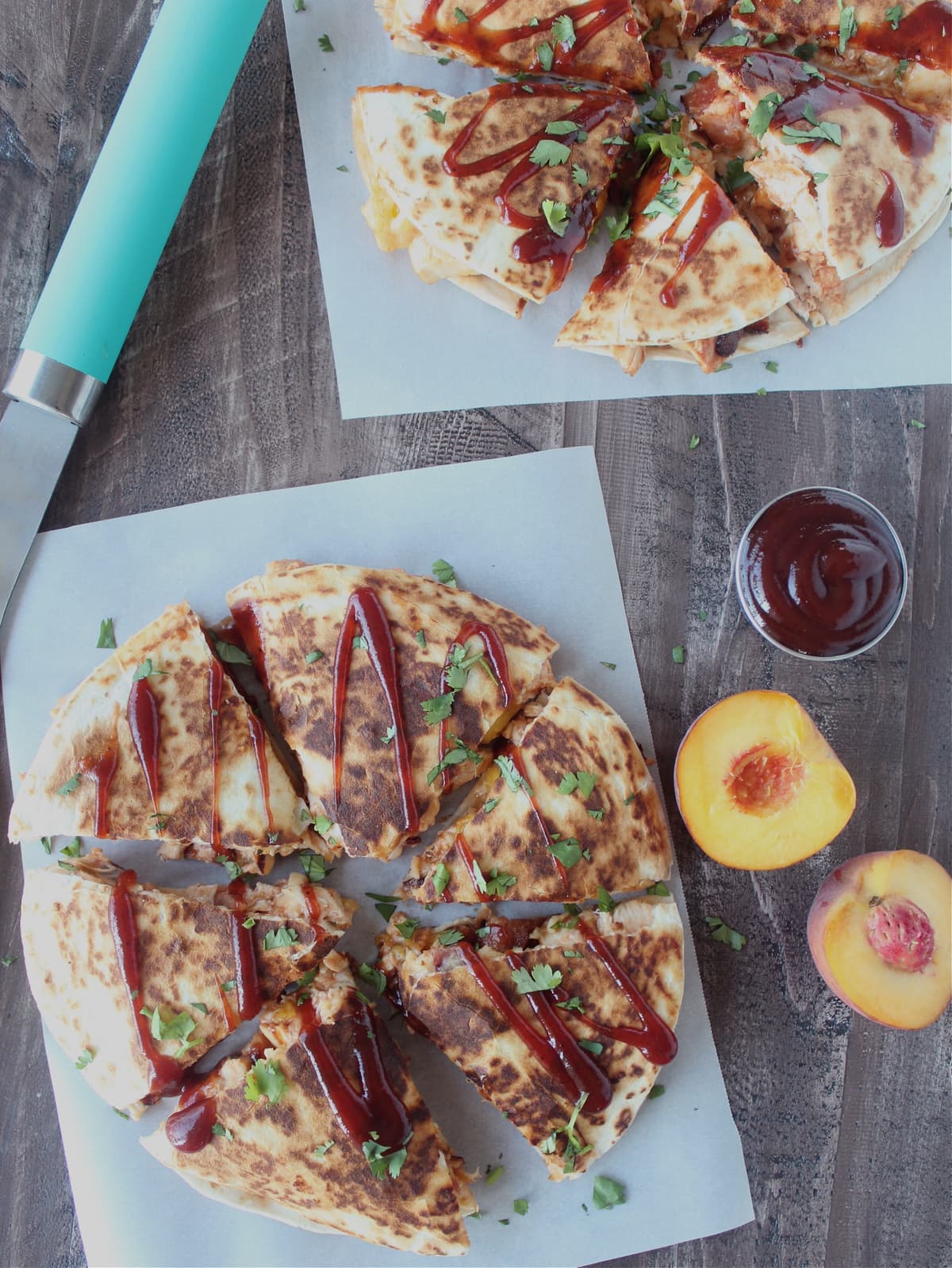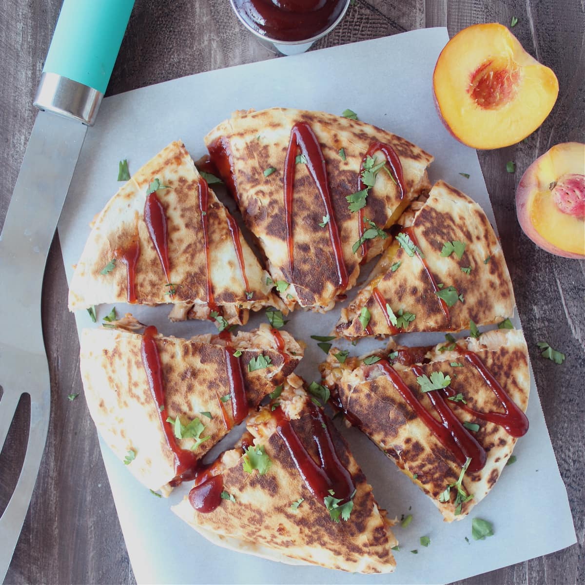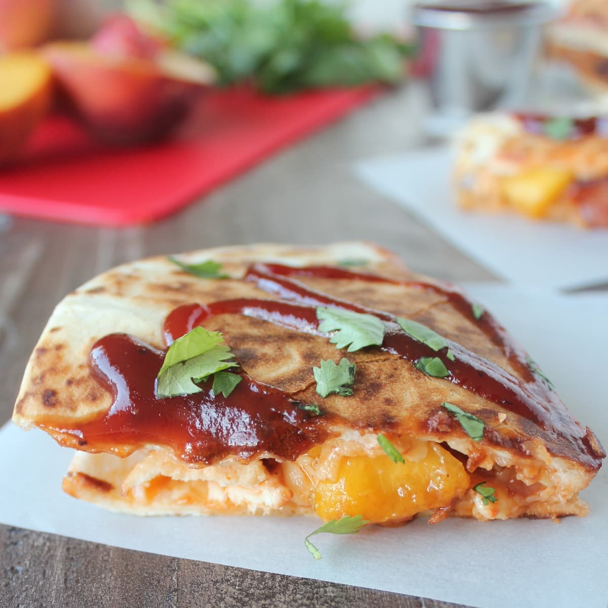 Grilled peaches, BBQ chicken, crispy bacon and spicy cheddar cheese are combined in this delicious, loaded cheddar quesadilla recipe!