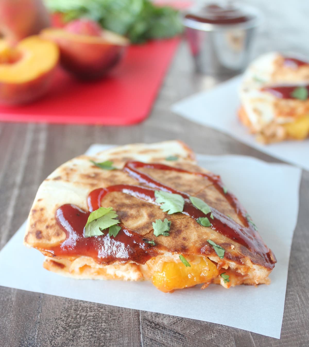 The crispy, toasty tortilla filled with the sweet BBQ chicken, grilled peaches, crispy, salty bacon and spicy, melty cheddar cheese, my mouth literally just watered while typing that sentence!