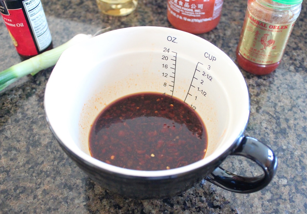 - Combine the soy sauce, sriracha, rice vinegar, honey and chili paste in a small bowl, set aside.