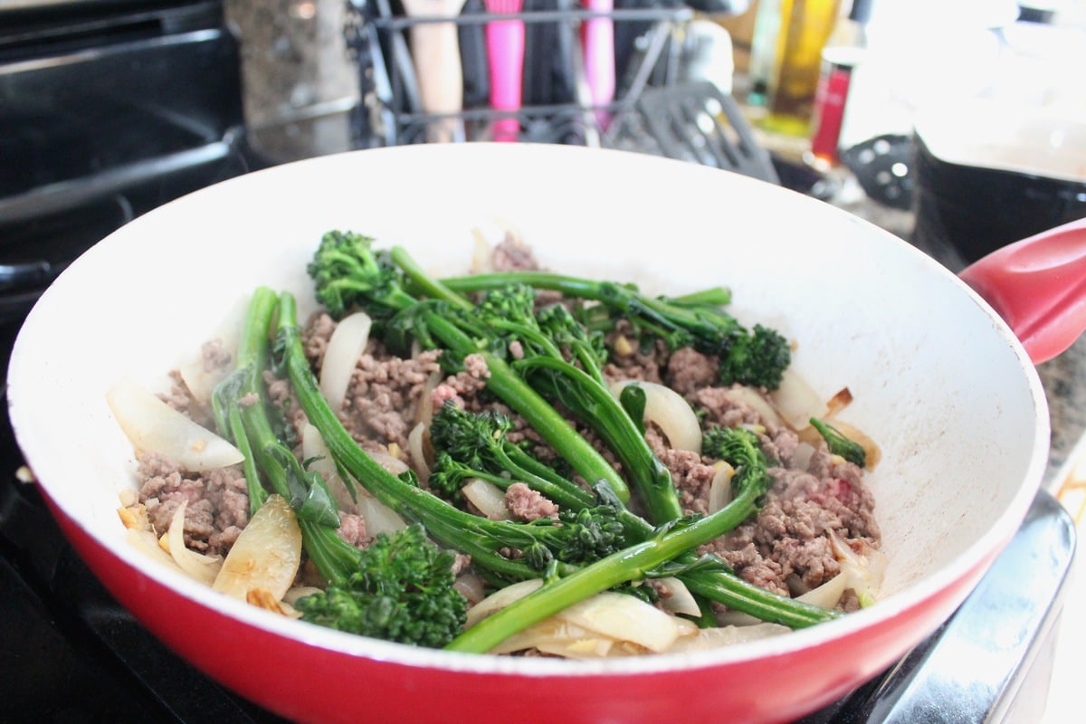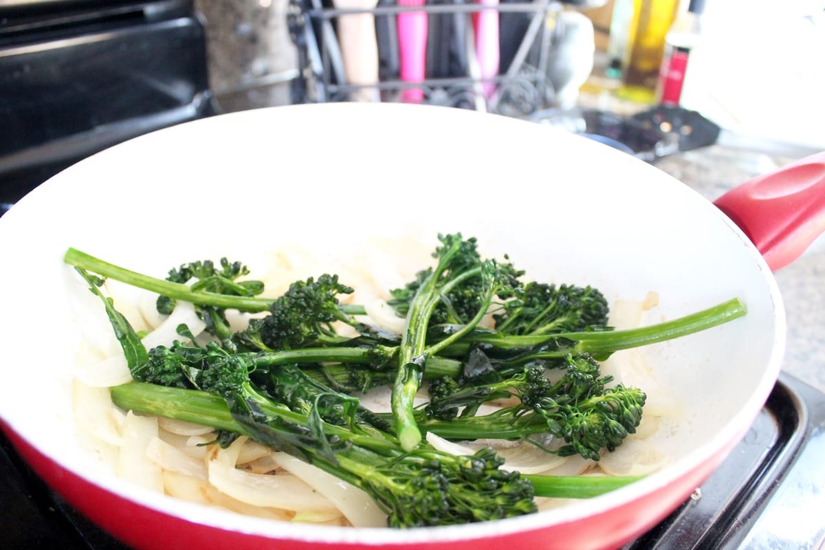 - Add the onions and broccoli, saute 4-5 minutes, then add the garlic and ginger, saute an additional 1-2 minutes.