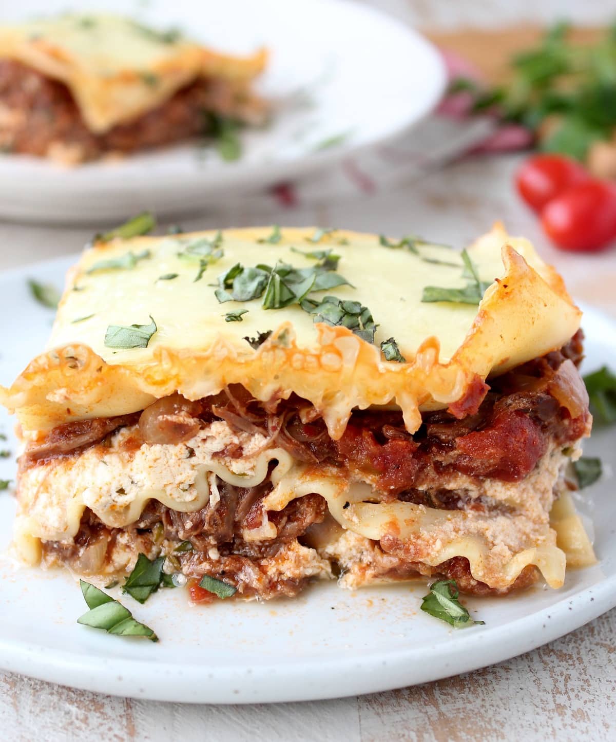 Simple slow cooked beef ragu is layered with creamy ricotta cheese, lasagna noodles and mozzarella cheese in the most delicious lasagna recipe ever!