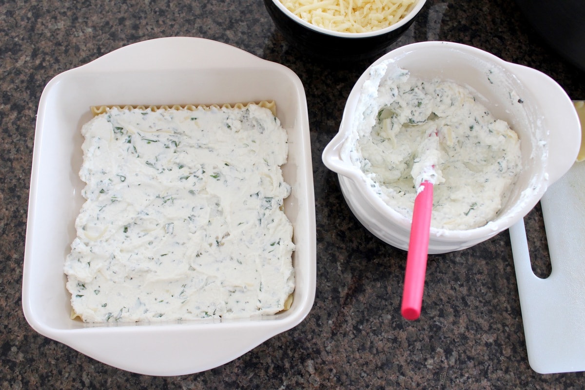 Spread a layer of the ricotta cheese mixture on the noodles.