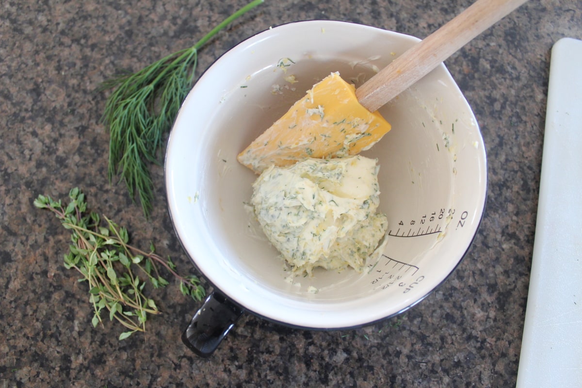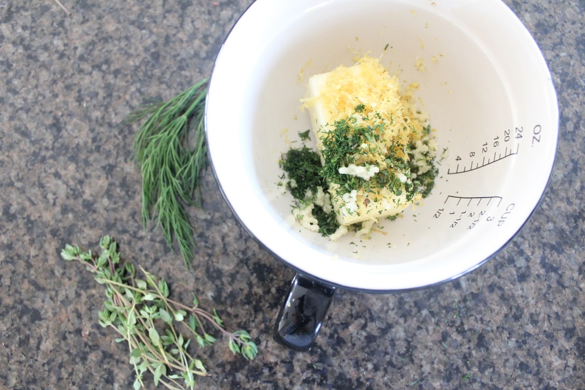 While the salmon is in the refrigerator, prepare the lemon dill compound butter by adding all of the ingredients to a medium bowl.
