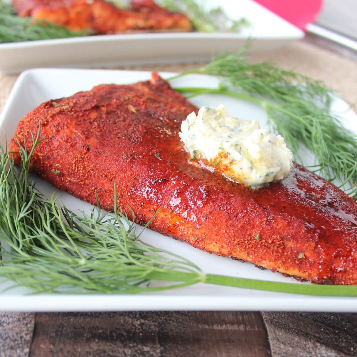 A combination of blackening spices coat this delicious grilled salmon recipe topped with homemade lemon herb compound butter.
