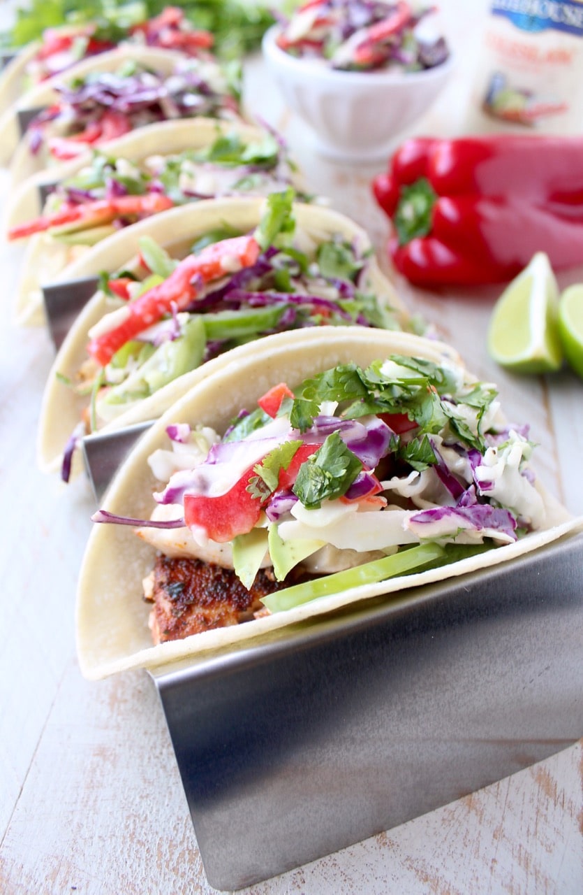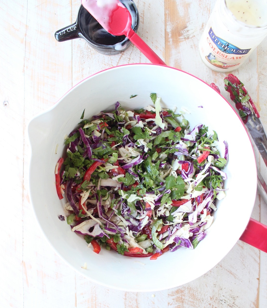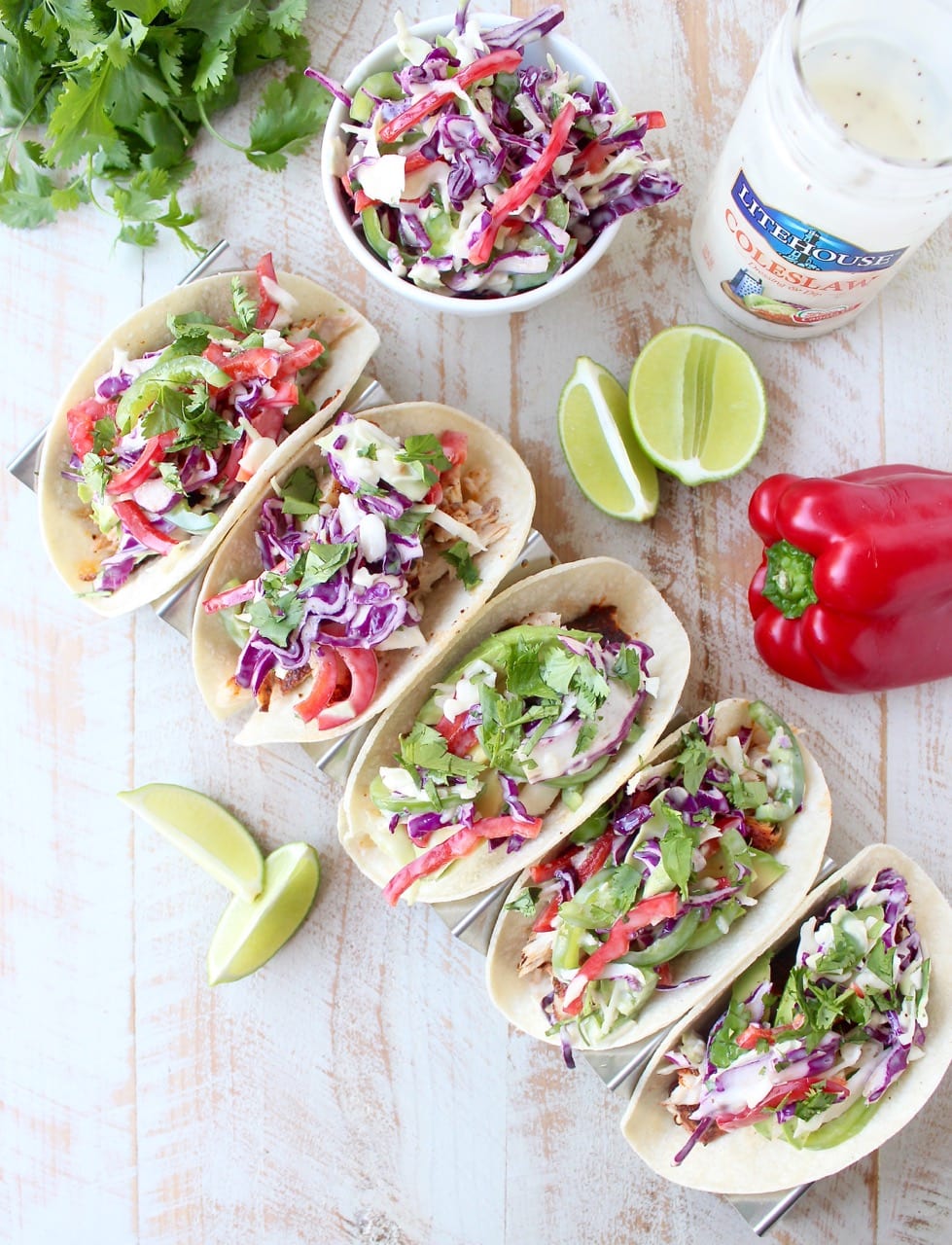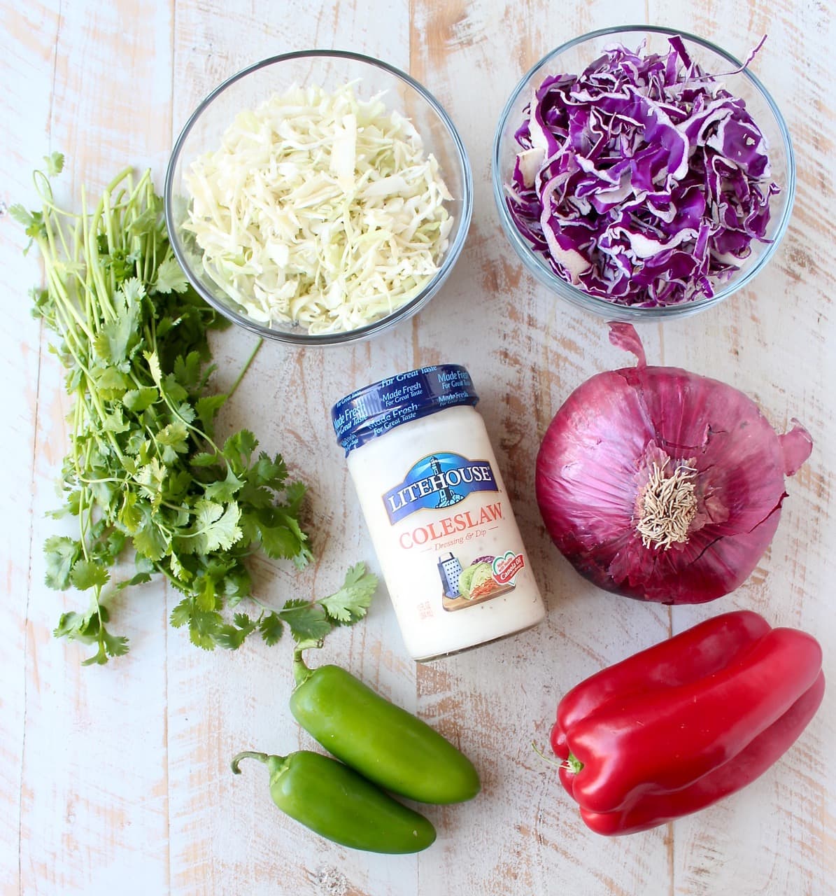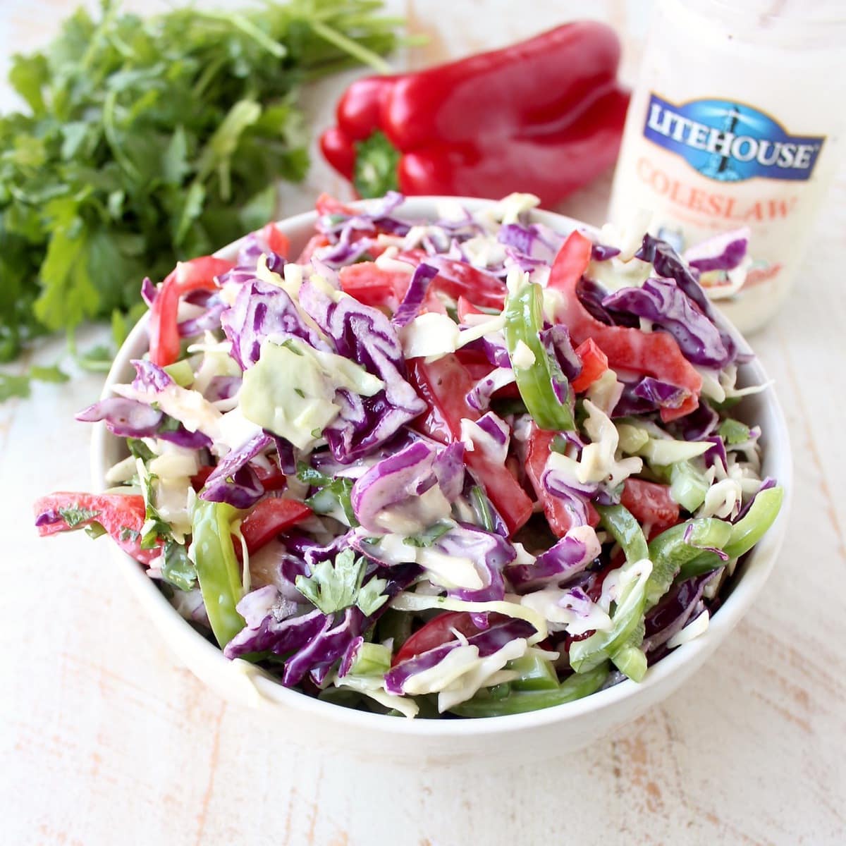 For this coleslaw recipe, I tossed cabbage, bell pepper, onion, jalapeno and cilantro with creamy Litehouse coleslaw dressing. It created the perfect crispy, sweet and spicy slaw to top the mahi mahi fish tacos!