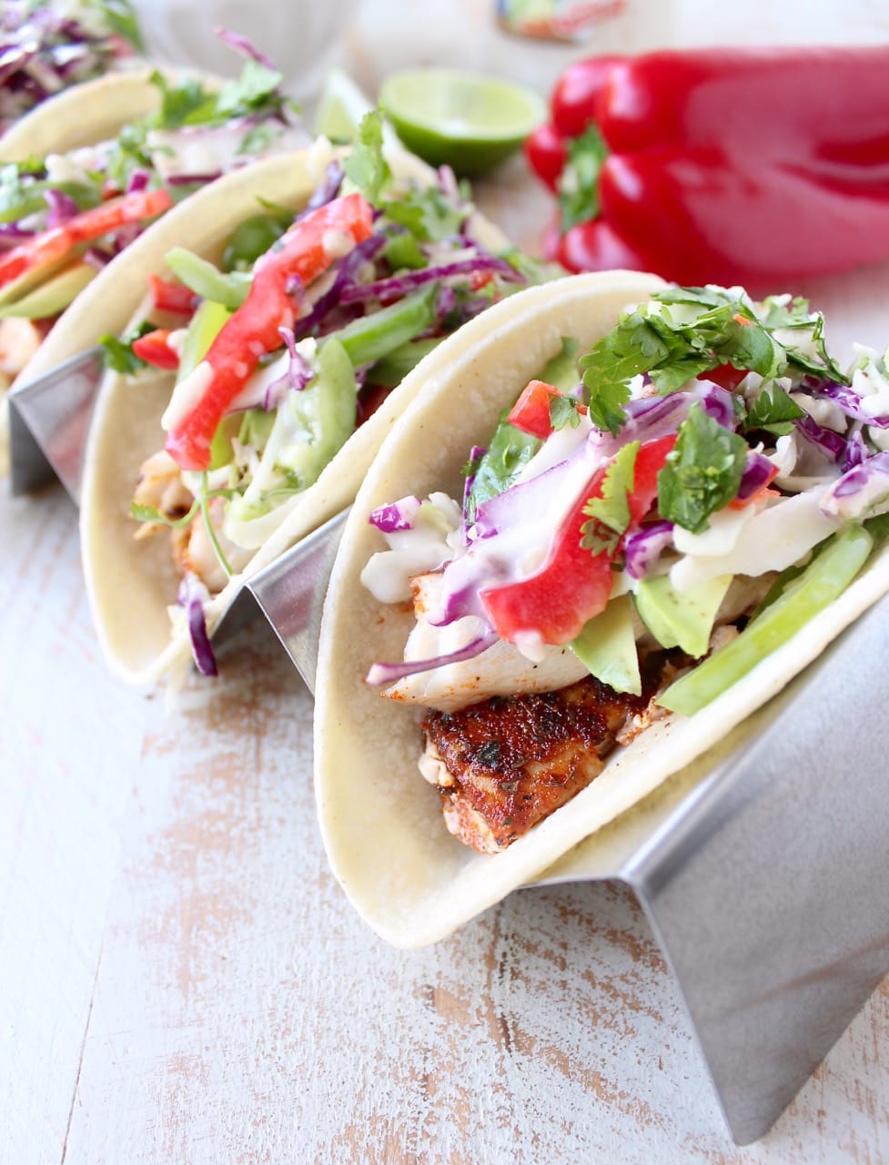 Last week, I was craving fish tacos, so I tossed together these blackened mahi mahi fish tacos and topped them with a fresh new coleslaw recipe.