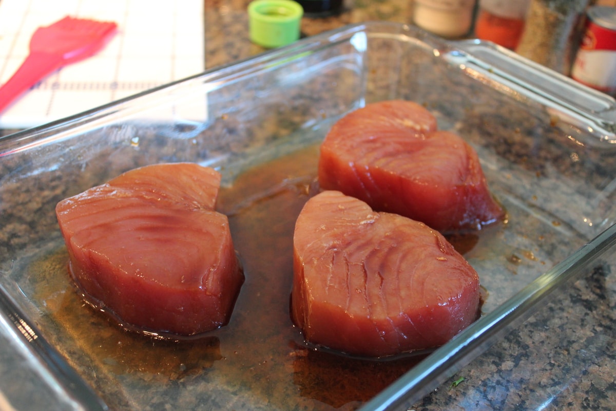 • Pour the soy sauce over the ahi steaks and brush on all sides.