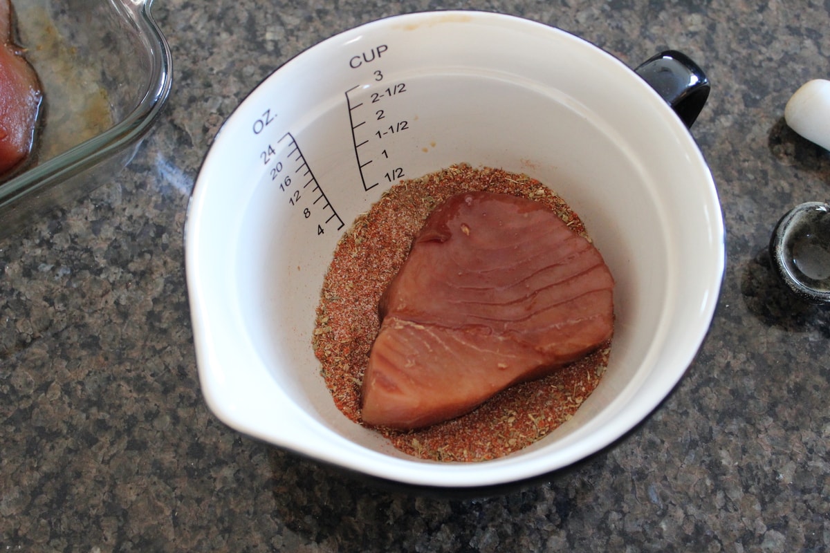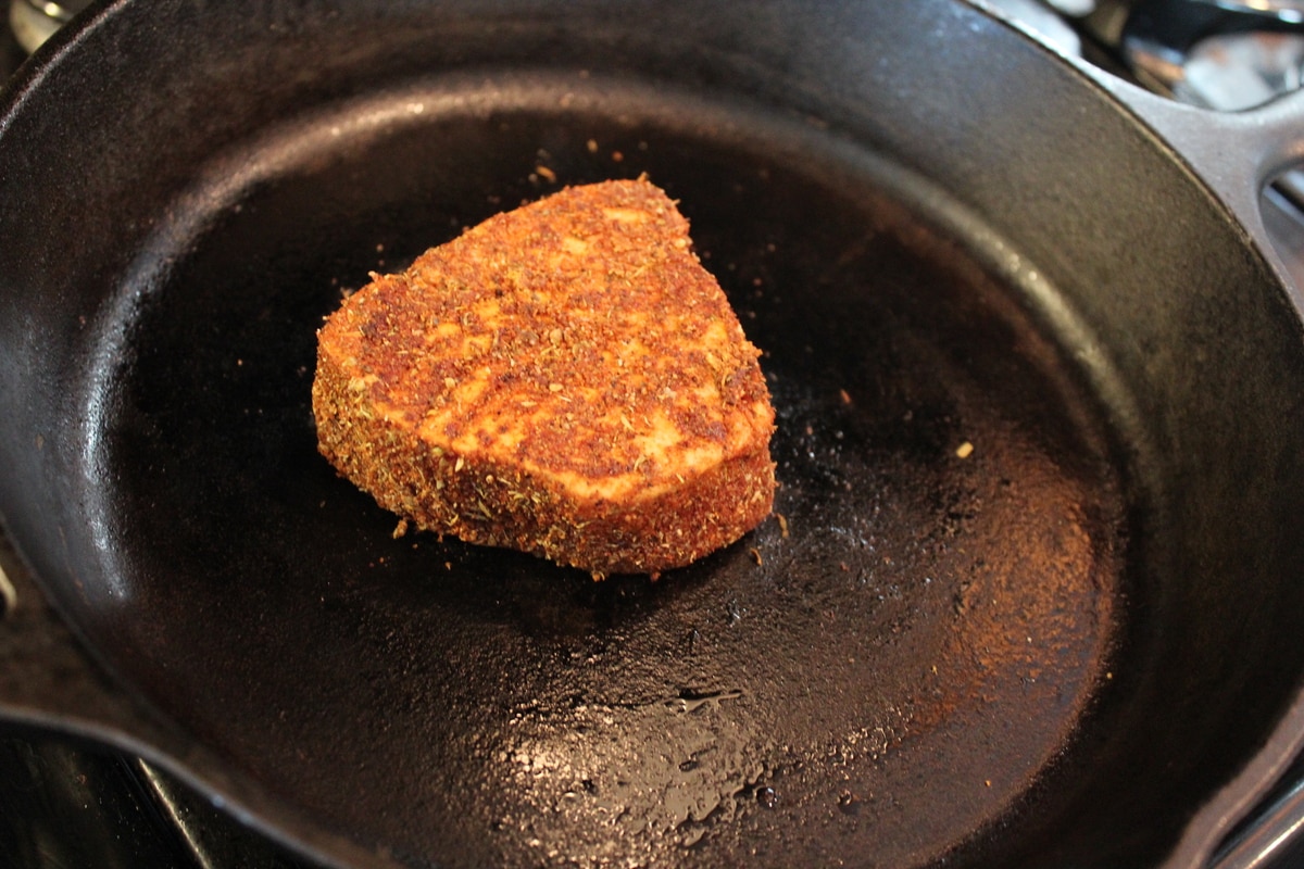 Remove the ahi steaks from the refrigerator and coat all sides with the blackening seasonings.