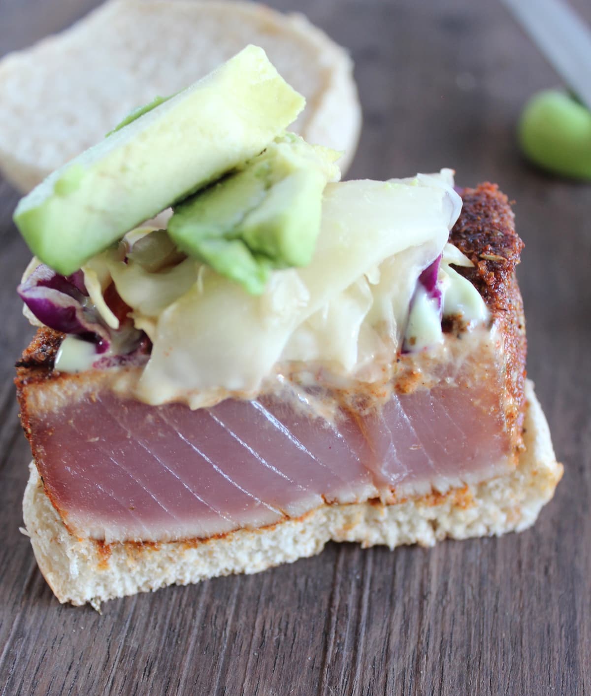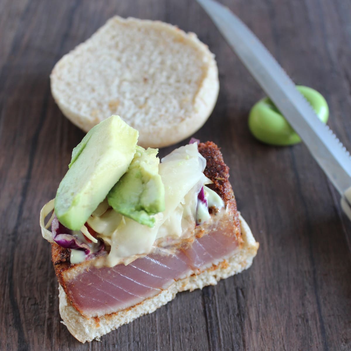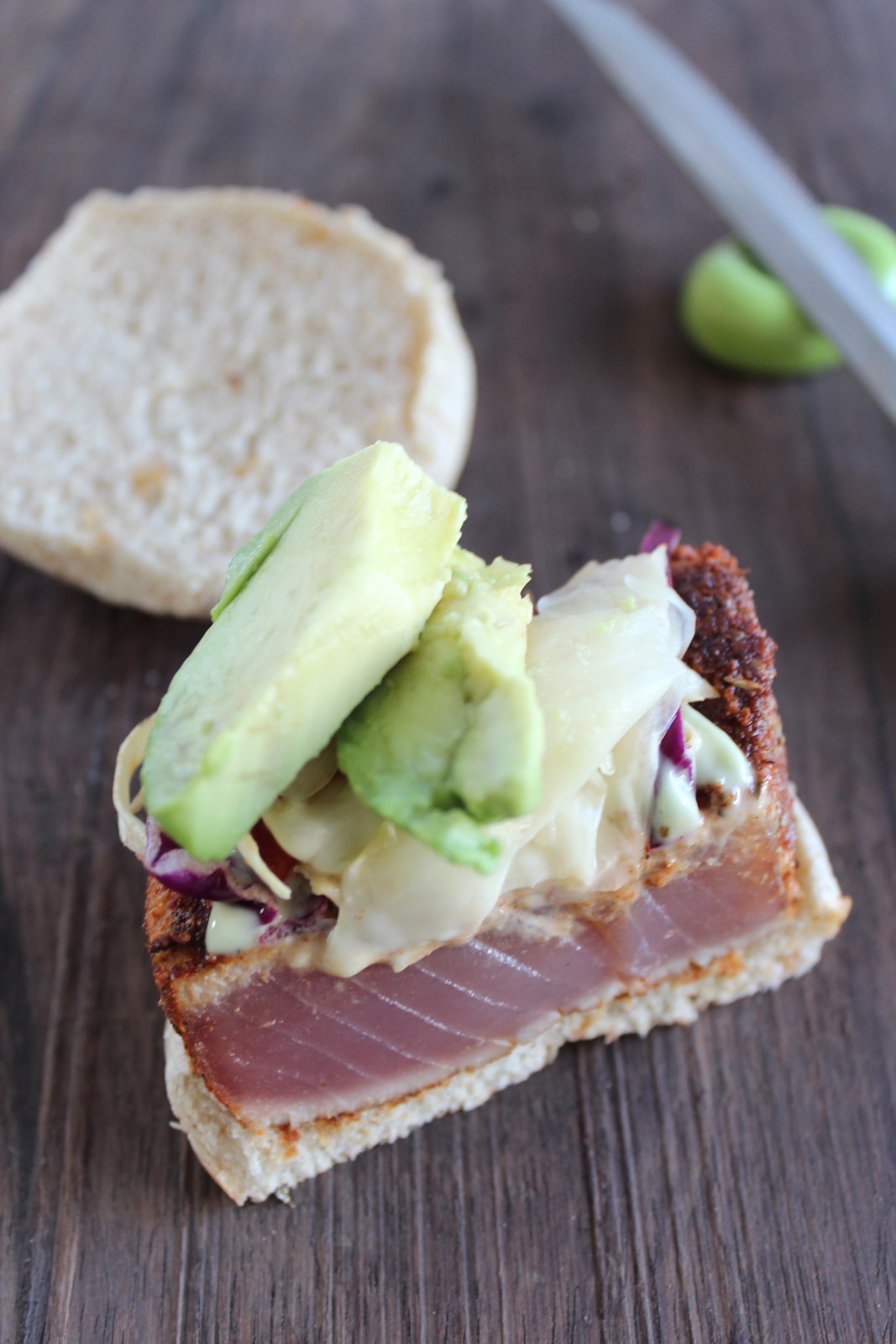 Blackened seared ahi tuna is topped with red pepper slaw, wasabi mayo and fresh avocado in this delicious ahi burger recipe!