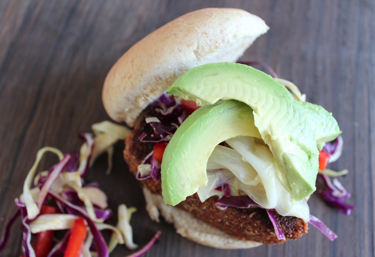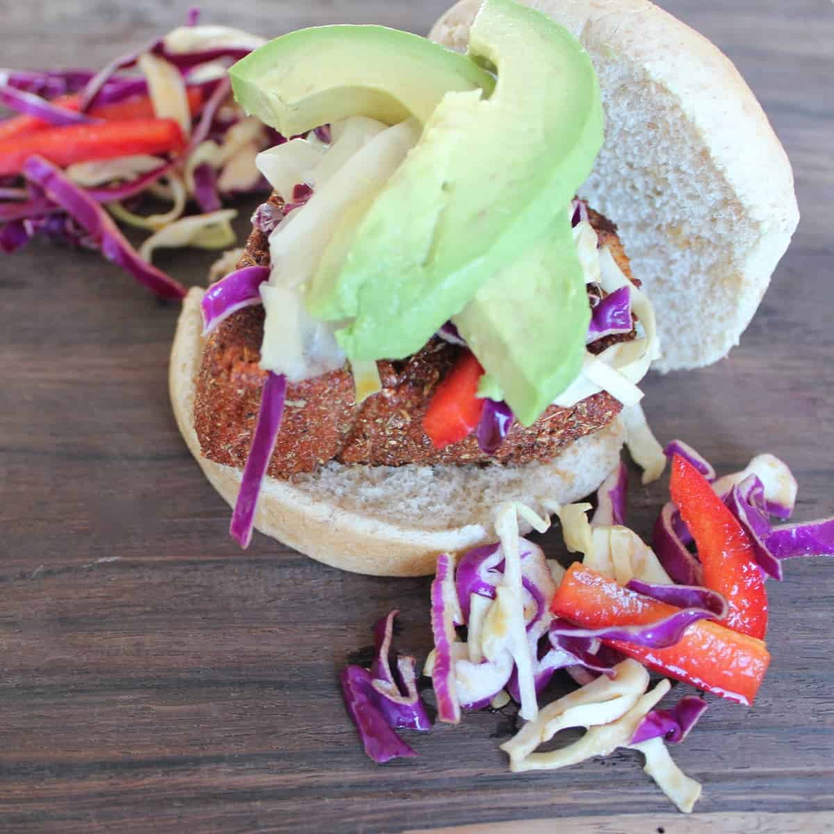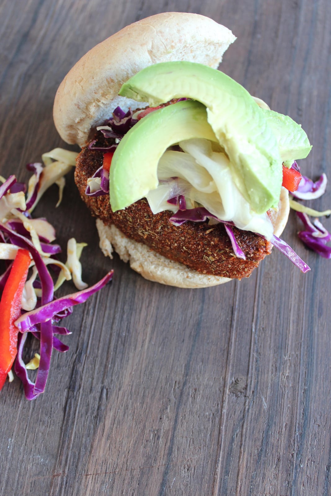 Blackened seared ahi tuna is topped with red pepper slaw, wasabi mayo and fresh avocado in this delicious ahi burger recipe!