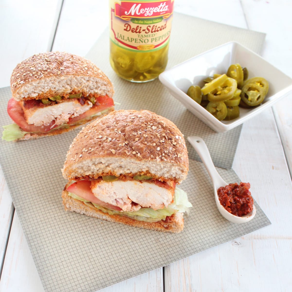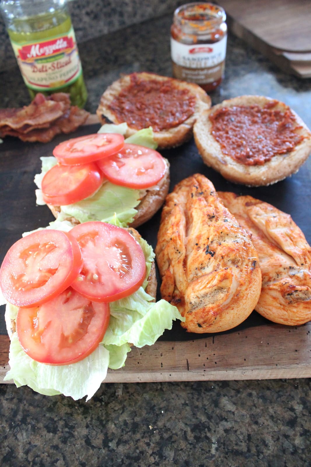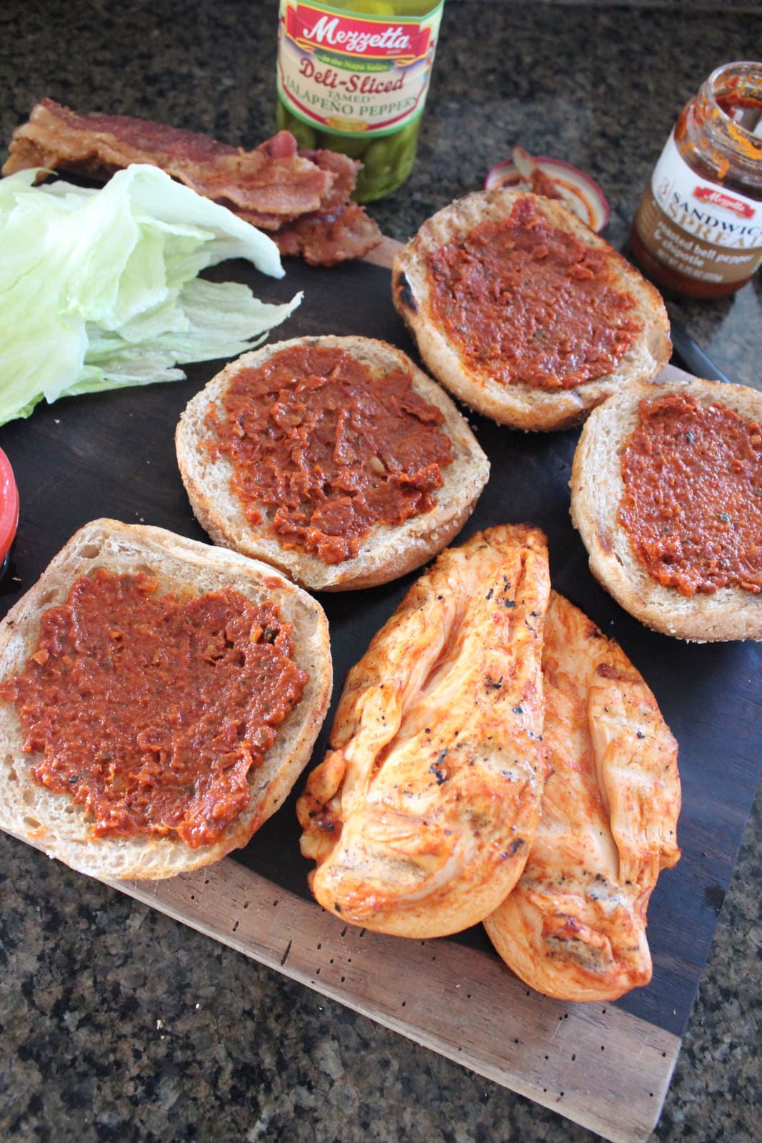 Remove the chicken and buns from the grill. Spread 1/2 tbsp of the Red Pepper Chipotle Spread on each bun.