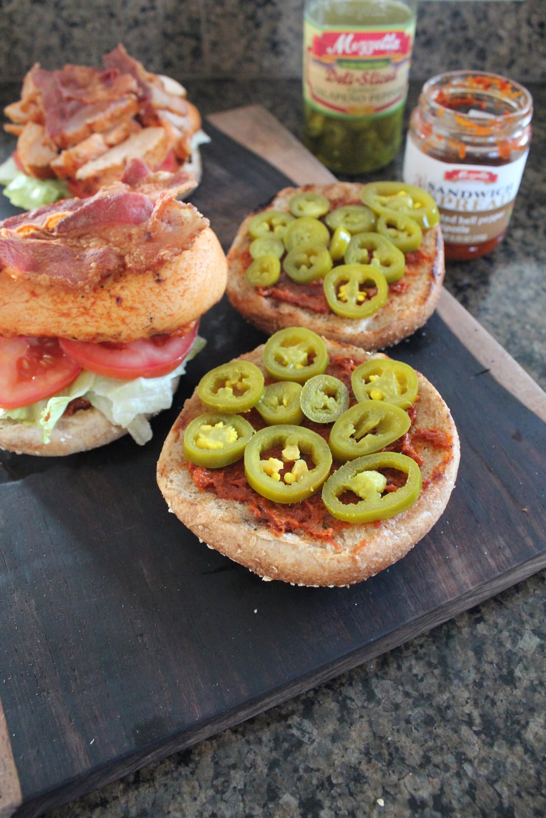 - Spread 1/2 tbsp of the Red Pepper Chipotle Spread on each bun.