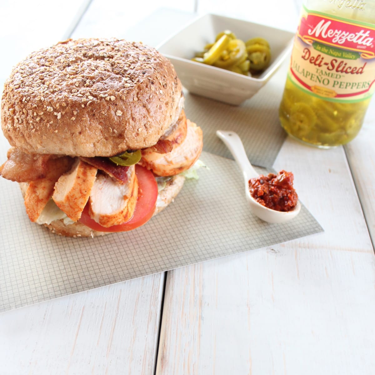 Grilled chipotle marinated chicken is topped with bacon, lettuce, tomatoes and jalapeños in this spicy, flavorful BLT Chipotle Chicken Sandwich recipe!