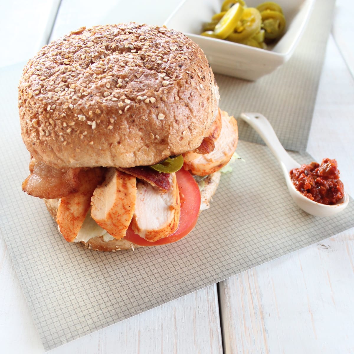 Tons of flavor in this sandwich, great crunch from the bacon and a slight heat from the chipotle chicken and spread! Overall, a winning combination!