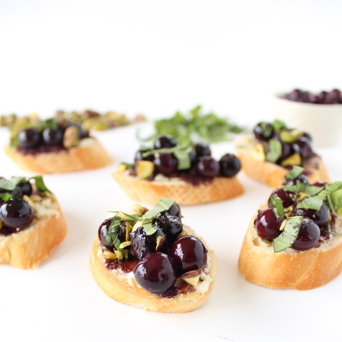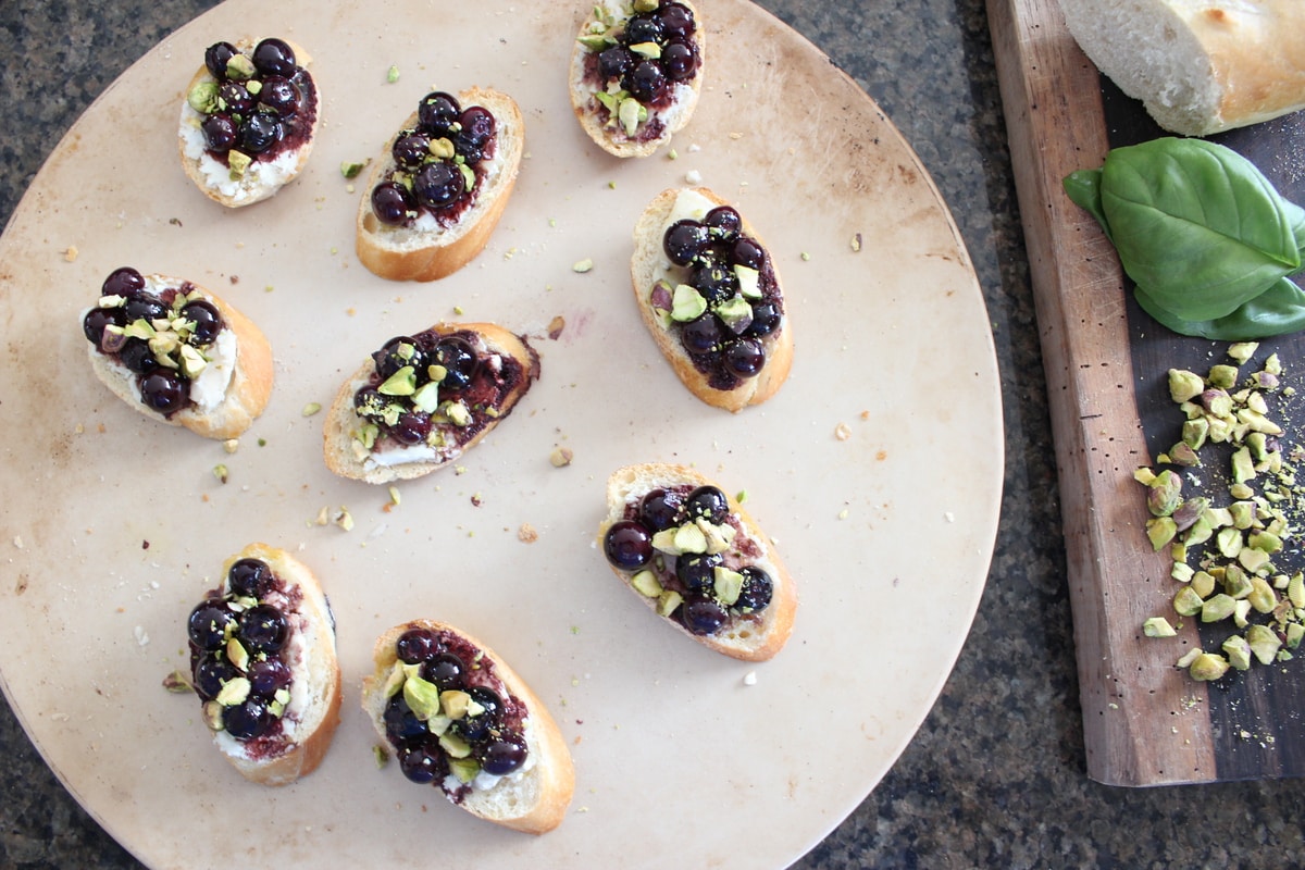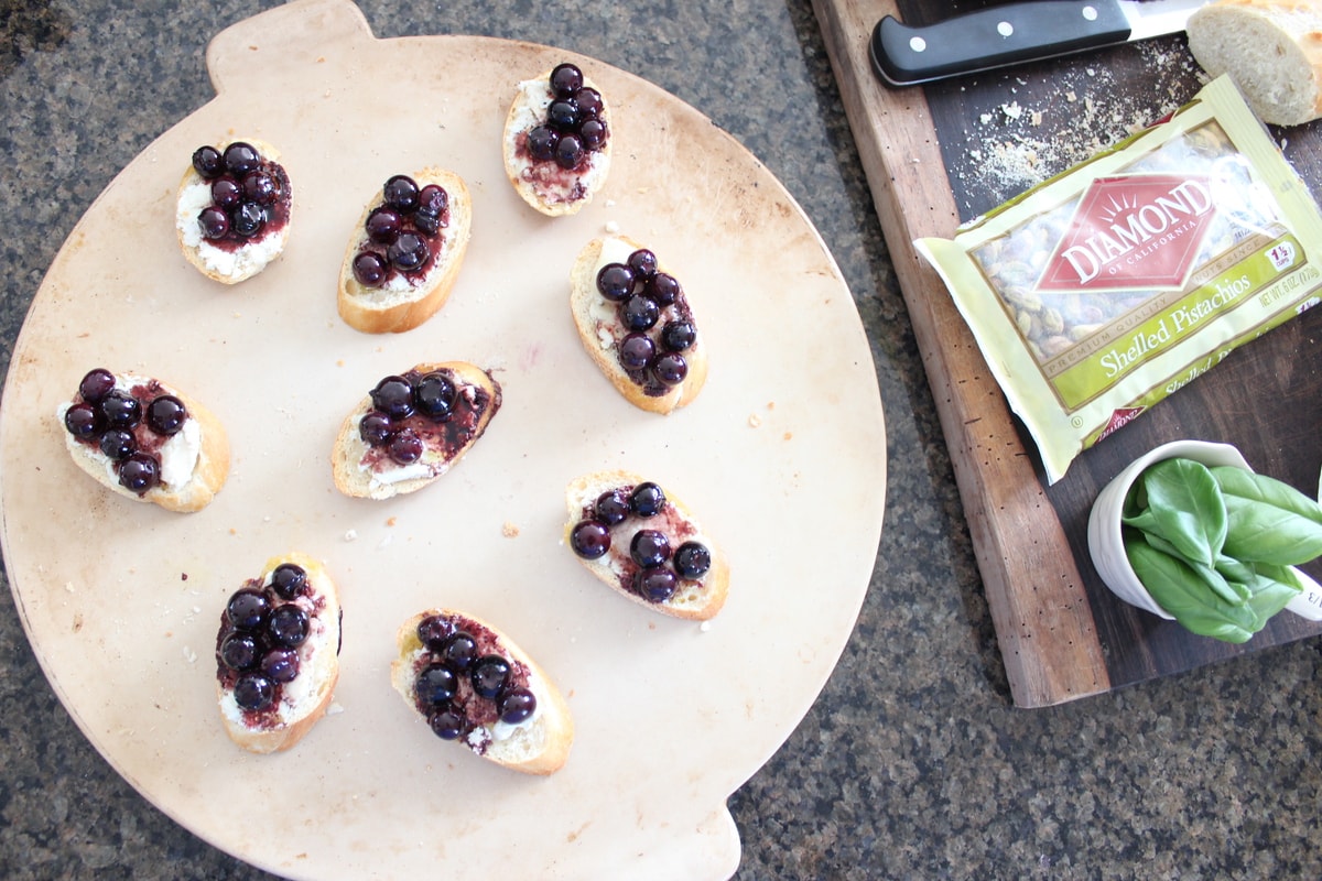Balsamic blueberries, creamy goat cheese, crushed pistachios and fresh basil are combined in this delicious goat cheese crostini recipe!