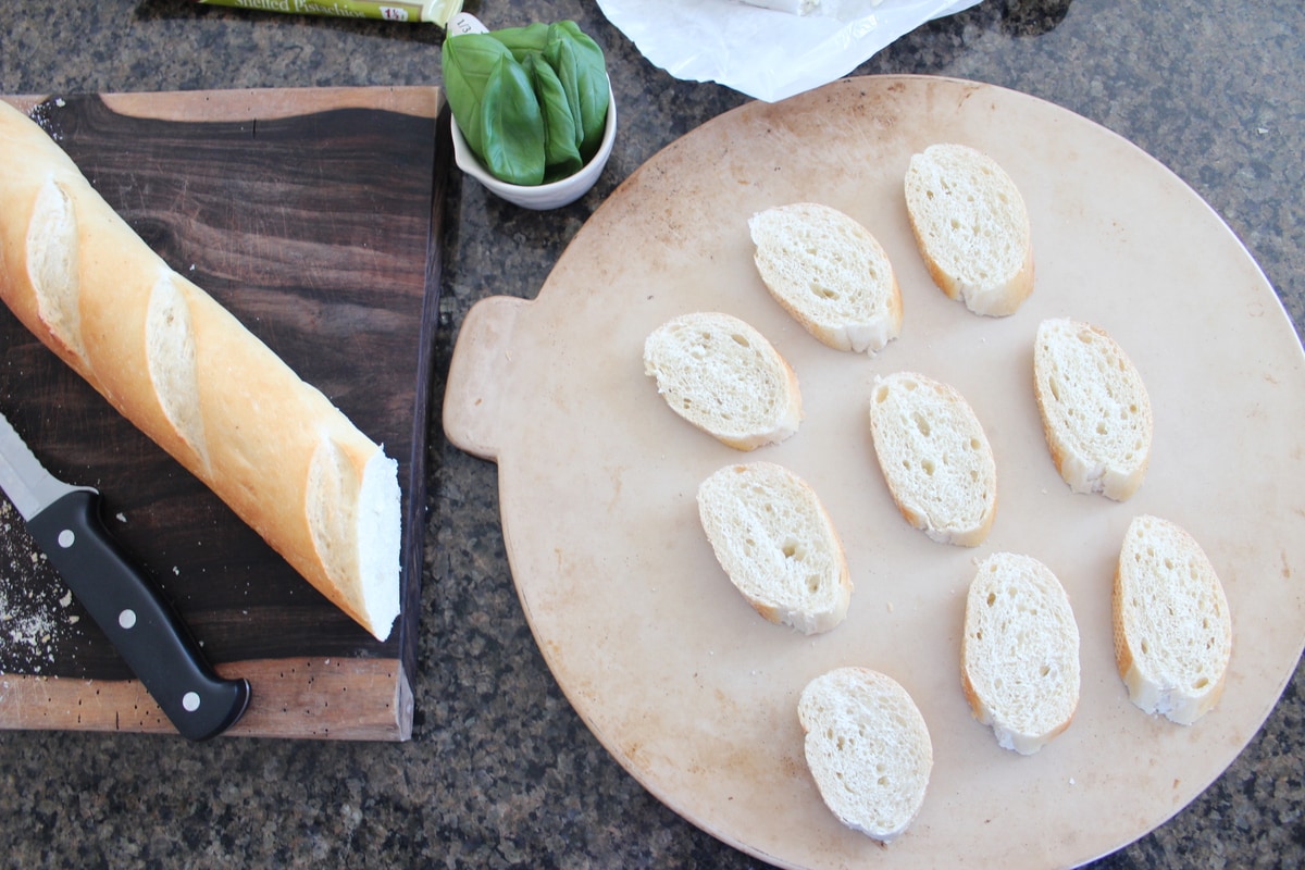 - Spread the goat cheese on the baguette, then place back into the oven for 2-3 minutes.