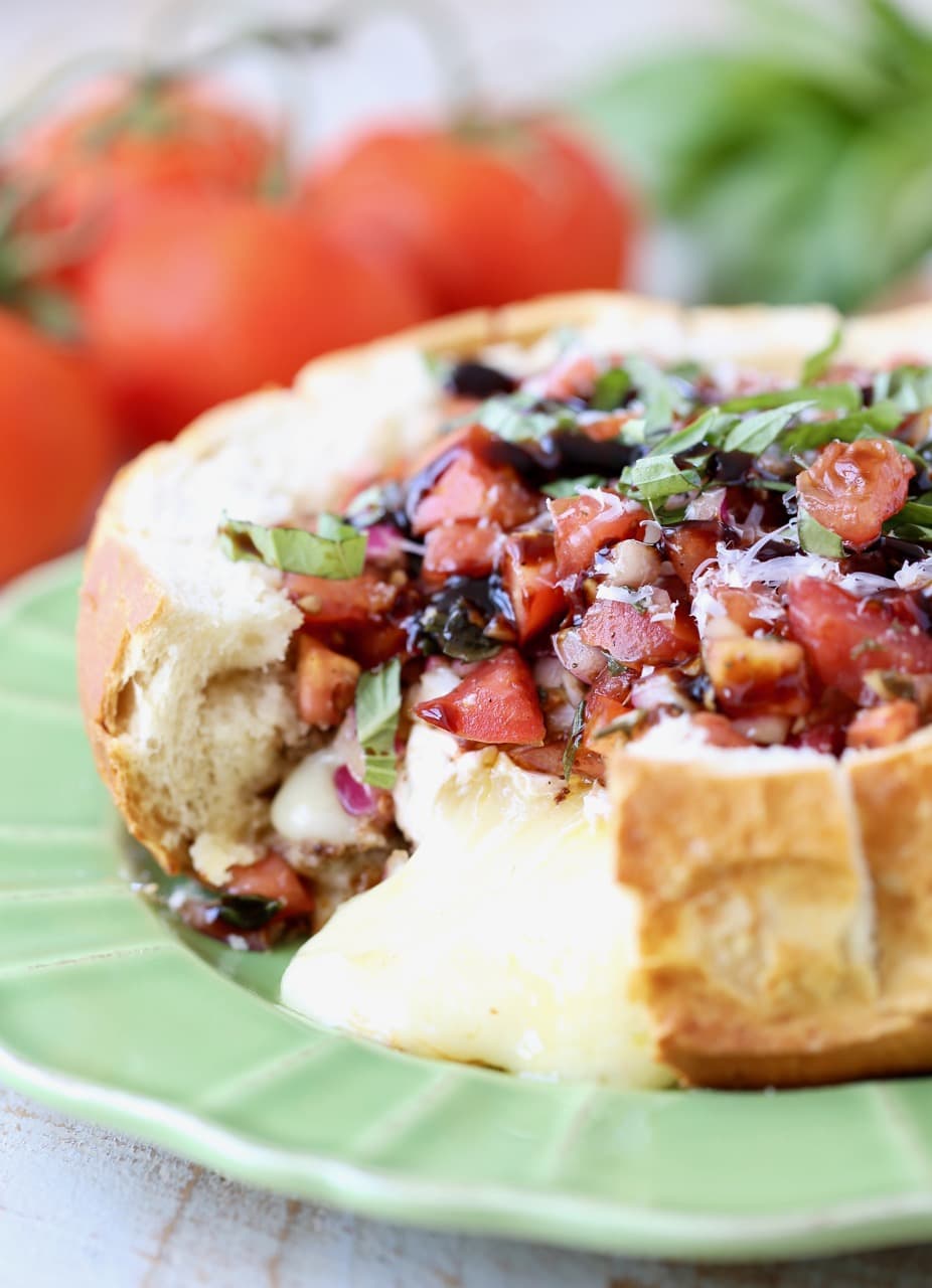 Inspired by the most popular recipe on the blog, Bruschetta Grilled Chicken Zoodle Bowls (6 MILLION views on Facebook & counting!), I combined the deliciously simple Tomato Basil Bruschetta recipe that tops the zoodle bowls, with luscious, creamy, baked brie, all snuggled in a delightfully crisp sourdough bread bowl. And let me tell you, it was amazing!
