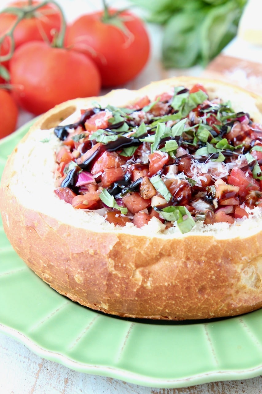 - Remove from the oven and drizzle with balsamic reduction. Slice the top piece of bread into cubes for dipping up the baked brie and bruschetta goodness. Cut slits every inch along the edge of the bread bowl, for easy pulling apart and dipping.