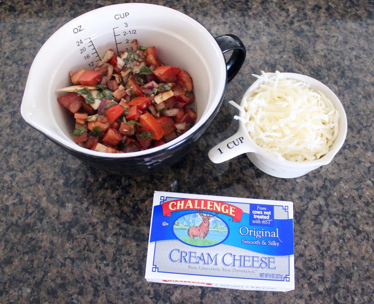 He realized before he actually added it to the bowl of Velvetta, but then I got an idea. What if I made an Italian version of “cheese dip” with bruschetta instead of Rotel and a combination of cream cheese and mozzarella instead of Velvetta?
