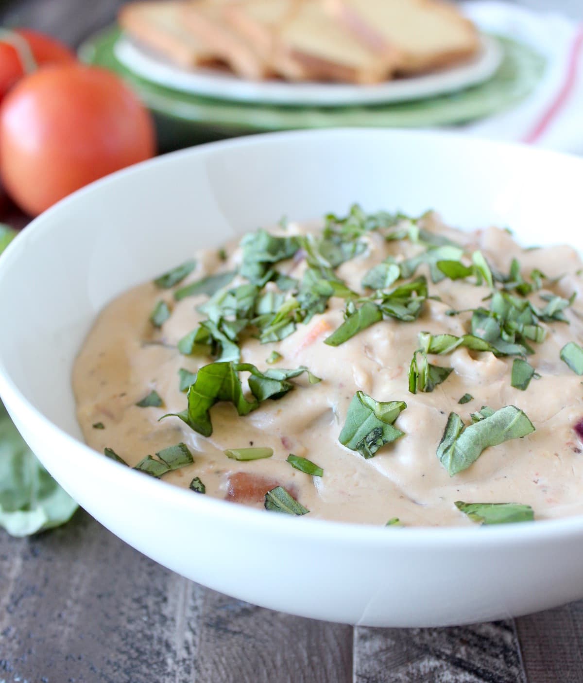 Fresh bruschetta combined with melted, creamy cheeses makes for one delicious bruschetta cheese dip recipe, made in only 10 minutes, perfect as a party appetizer!