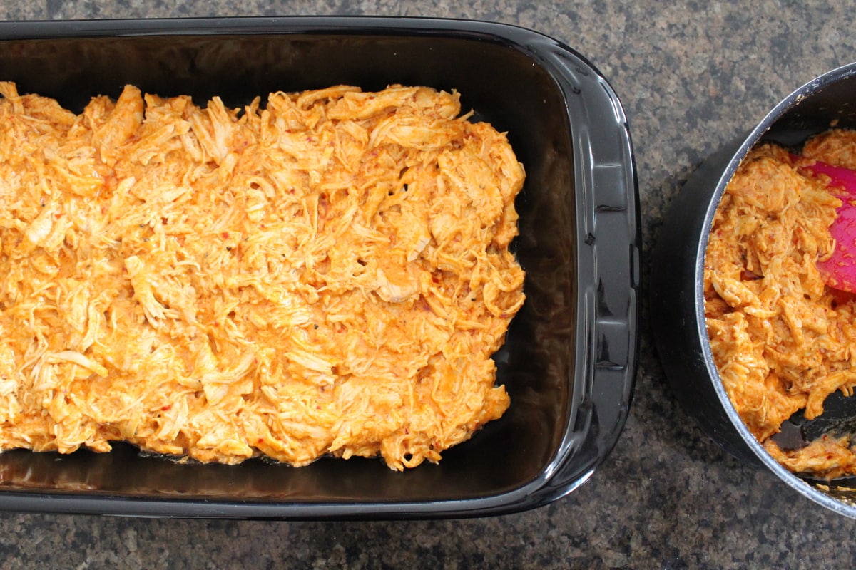 - Place half of the buffalo chicken alfredo sauce in the bottom of a 9 x 13 baking dish.