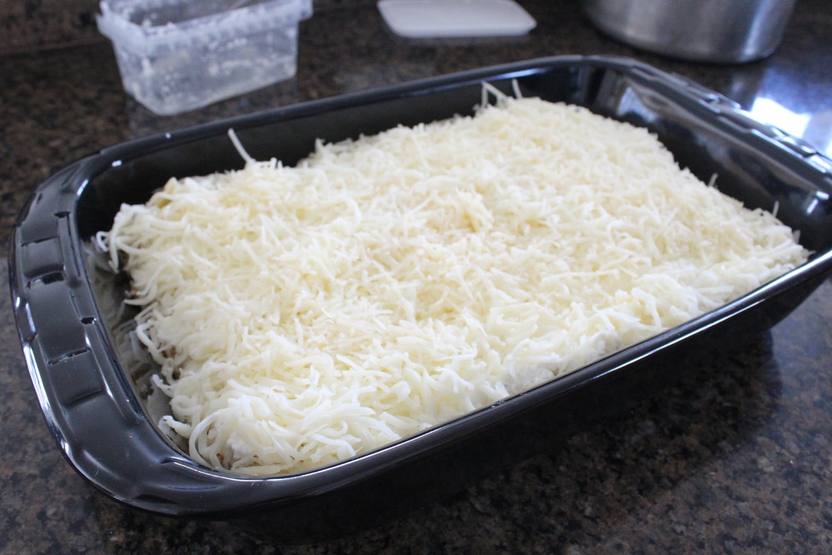 Top with three lasagna noodles and the remaining ricotta cheese, then sprinkle the mozzarella cheese and remaining ½ cup of parmesan cheese on top.