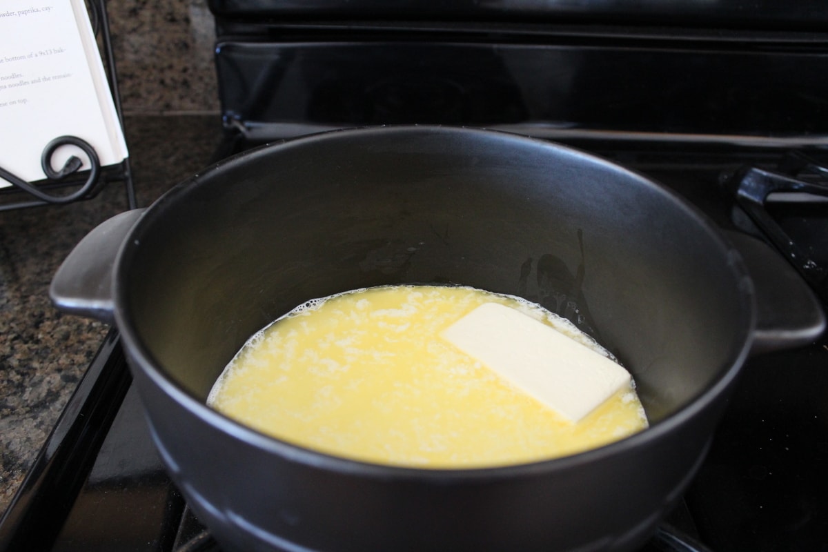 To prepare the alfredo sauce, add the butter to a large pot over medium-high heat.
