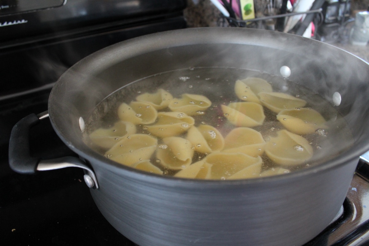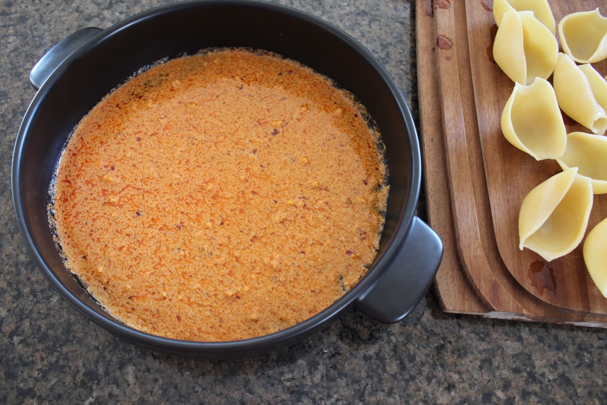 - Cook the pasta shells in boiling water, drain and set aside to cool.