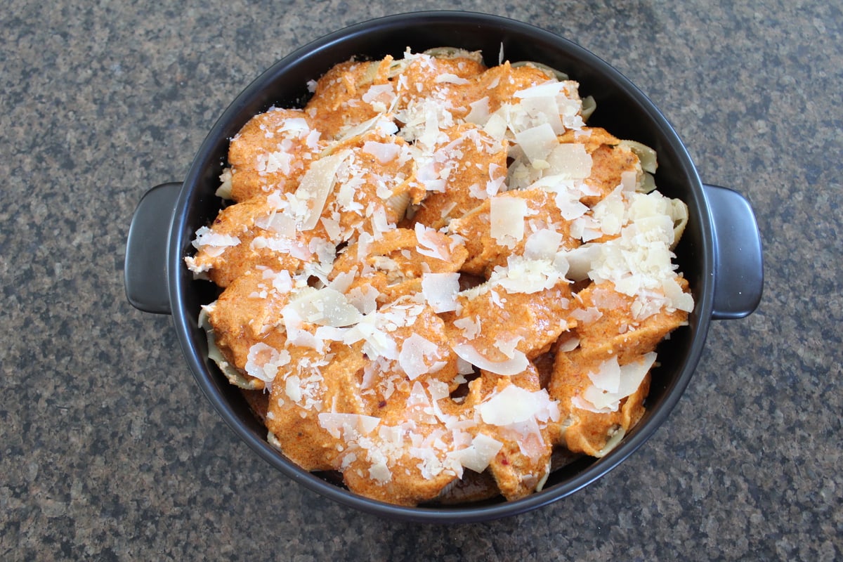 - Pour the remainder of the sauce over the shells, then sprinkle the remaining ½ cup parmesan cheese on top.