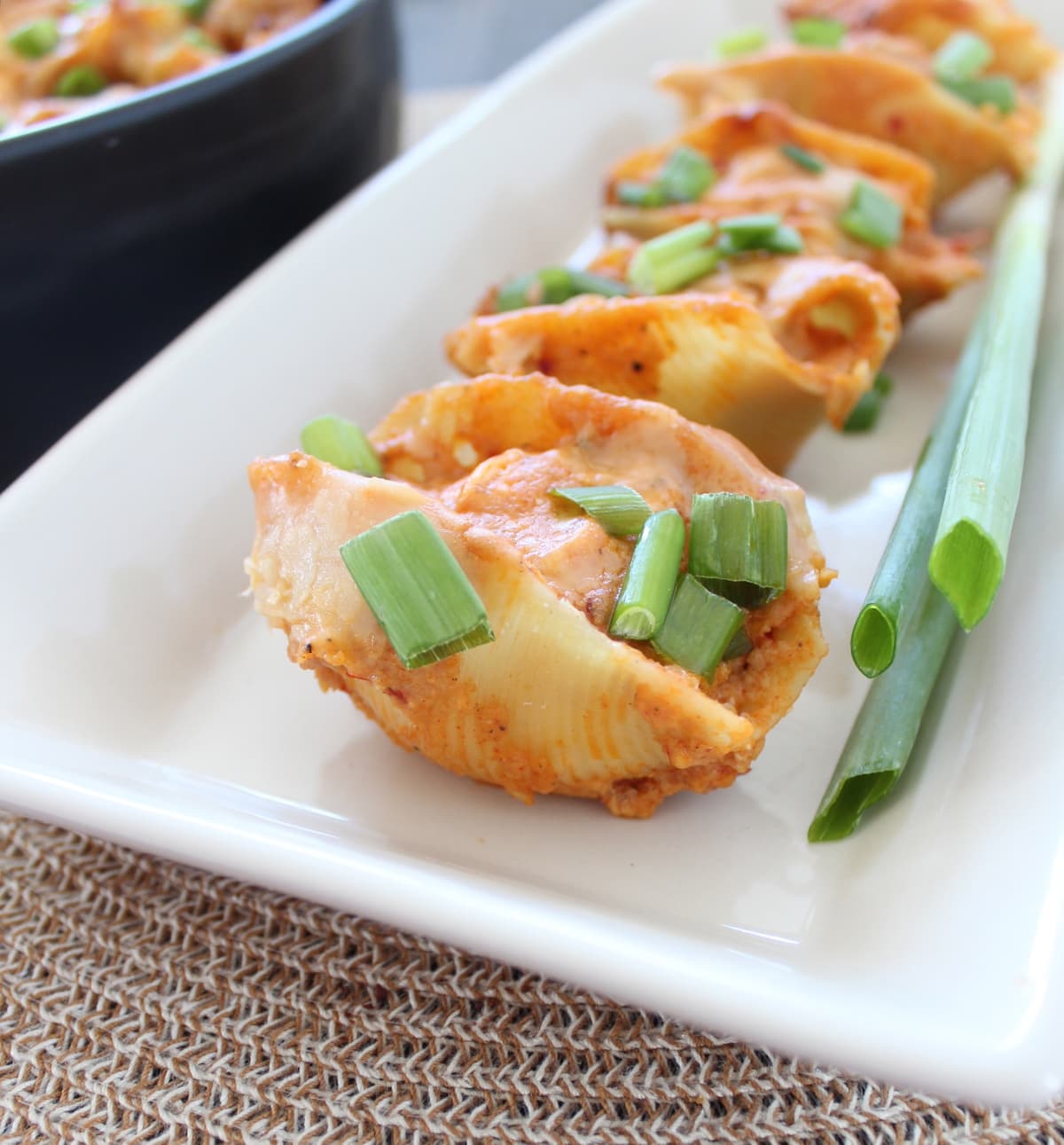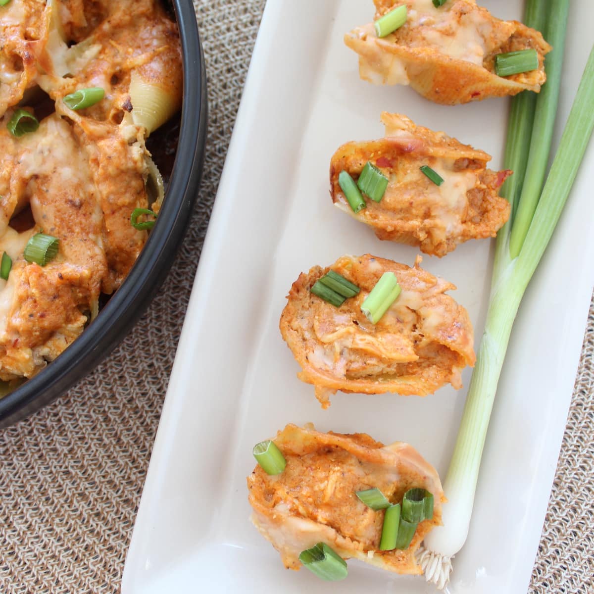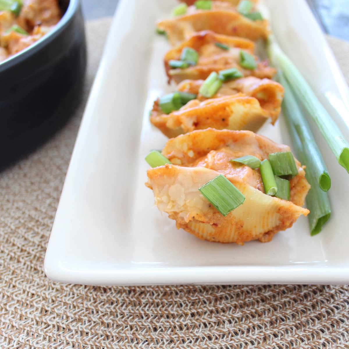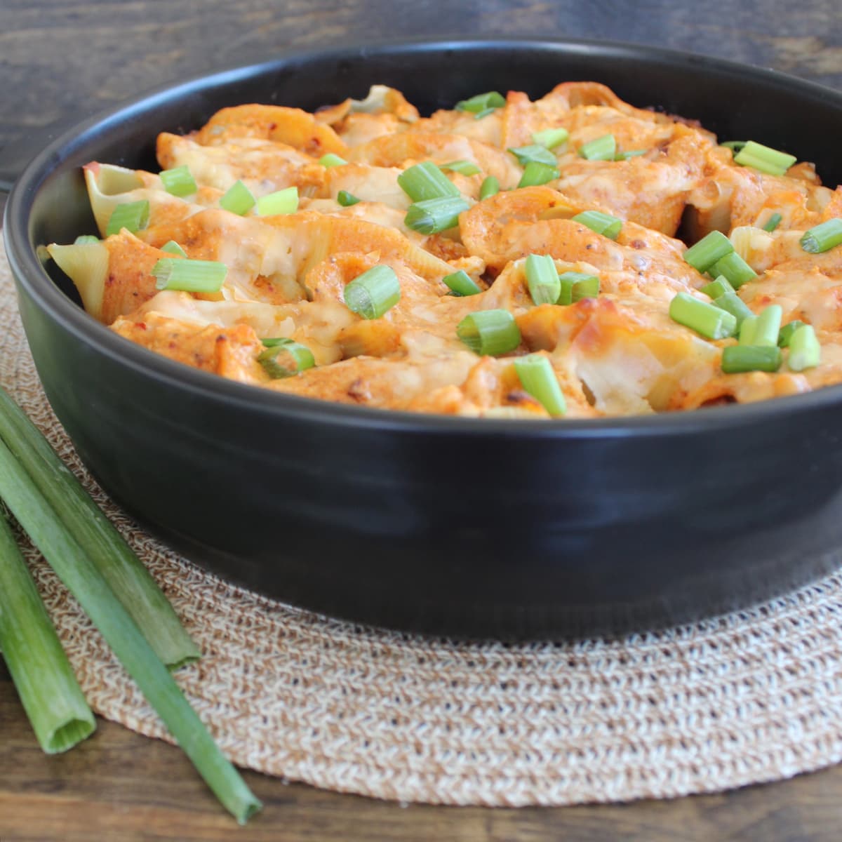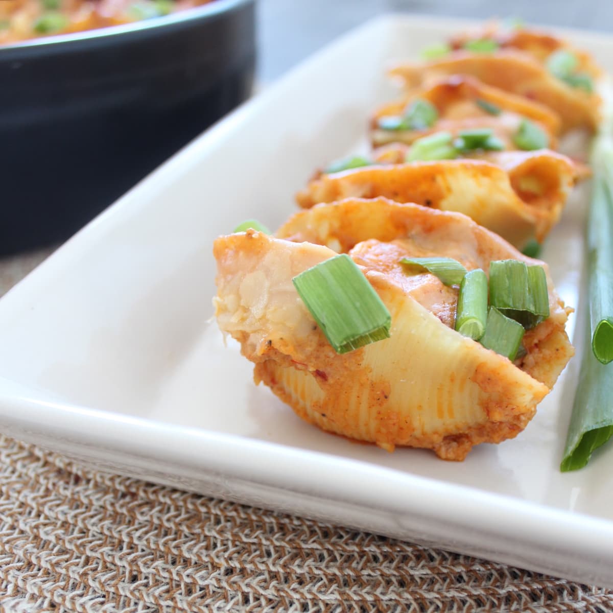 Buffalo Chicken Alfredo Sauce is stuffed into pasta shells in this hearty dish filled with chicken, cheese and spicy buffalo sauce.