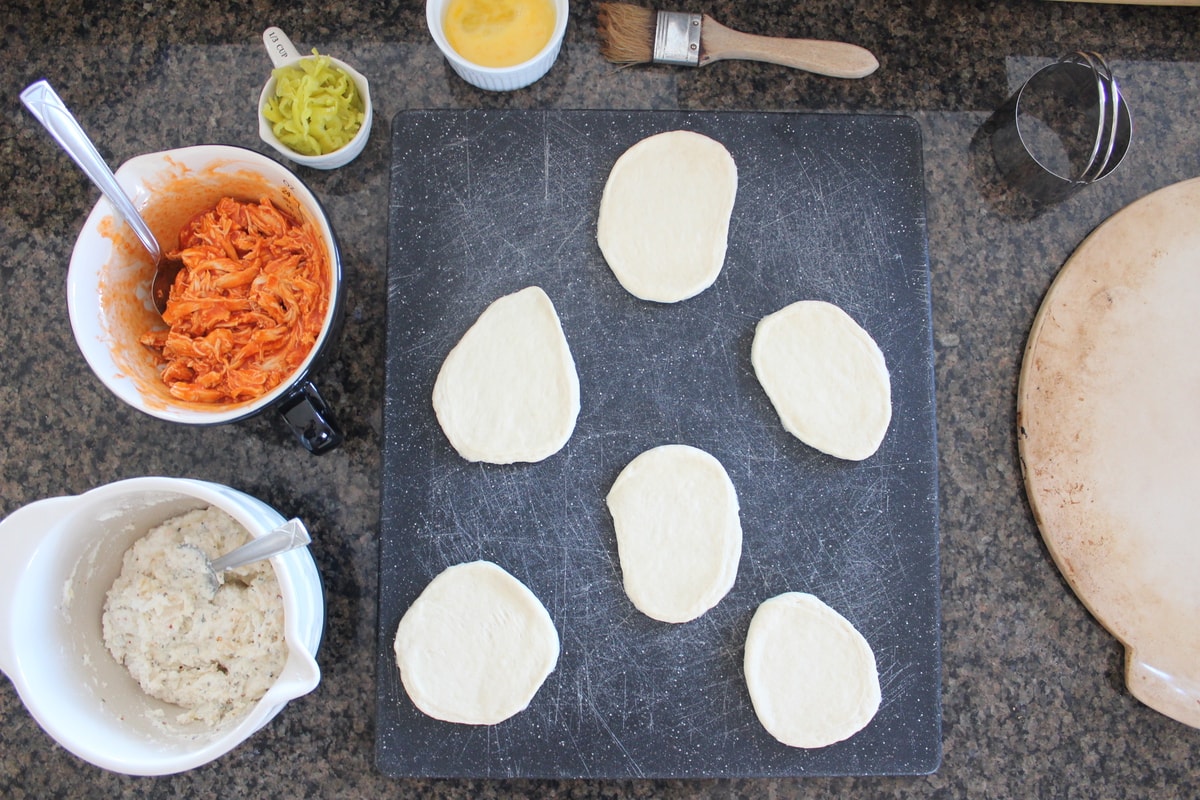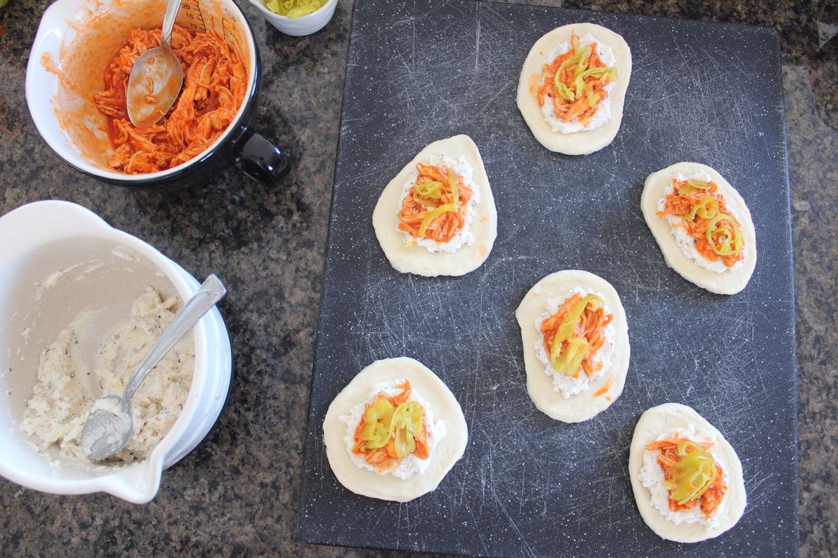 - Place a spoonful of buffalo chicken in the middle of each circle, then top with a couple of pepperoncinis.