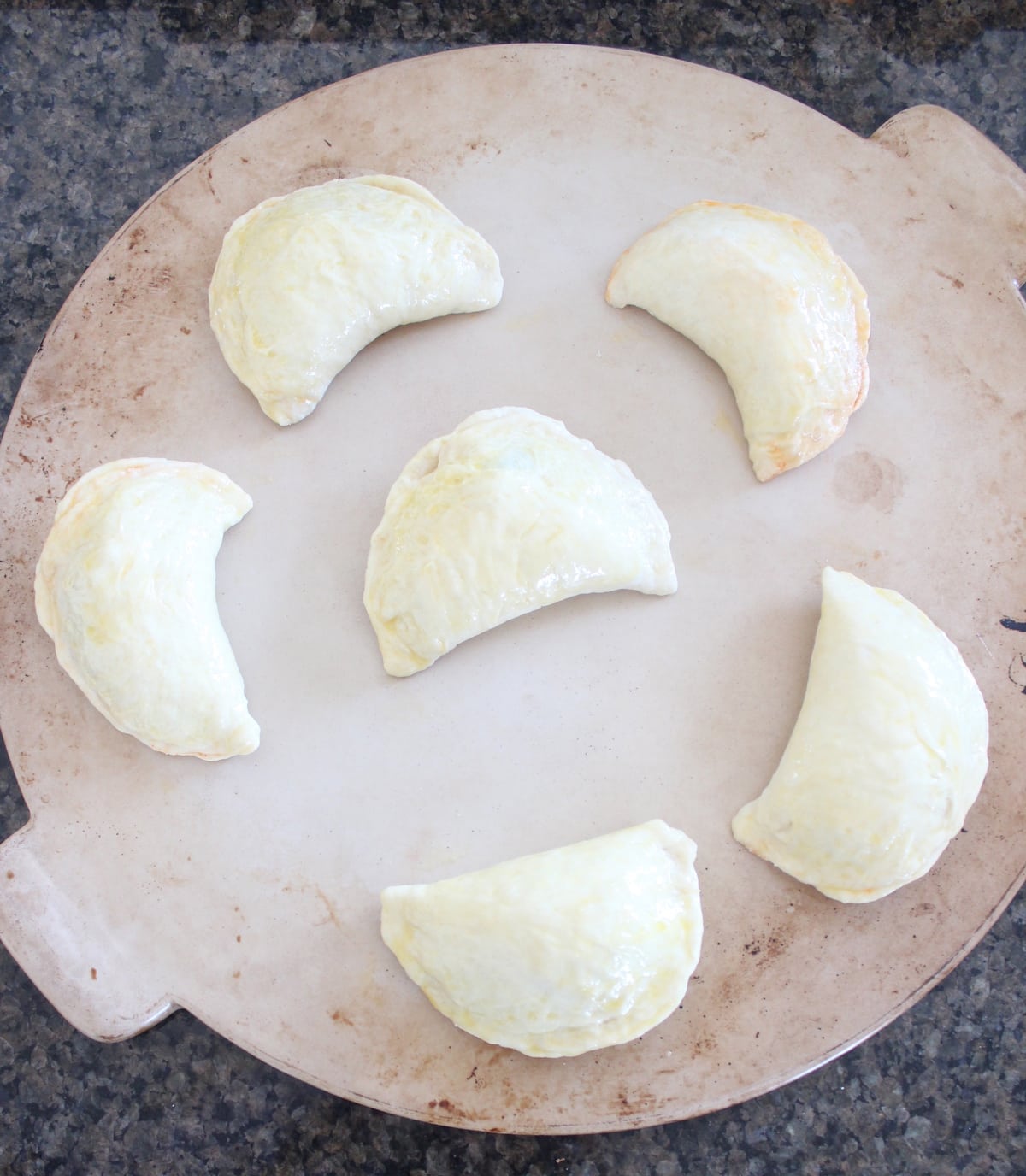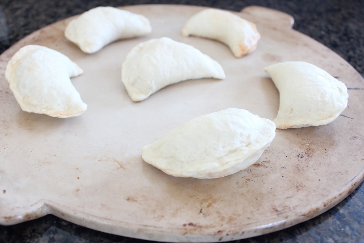 - Pick up each calzone and stretch two sides of the dough out and over the filling.