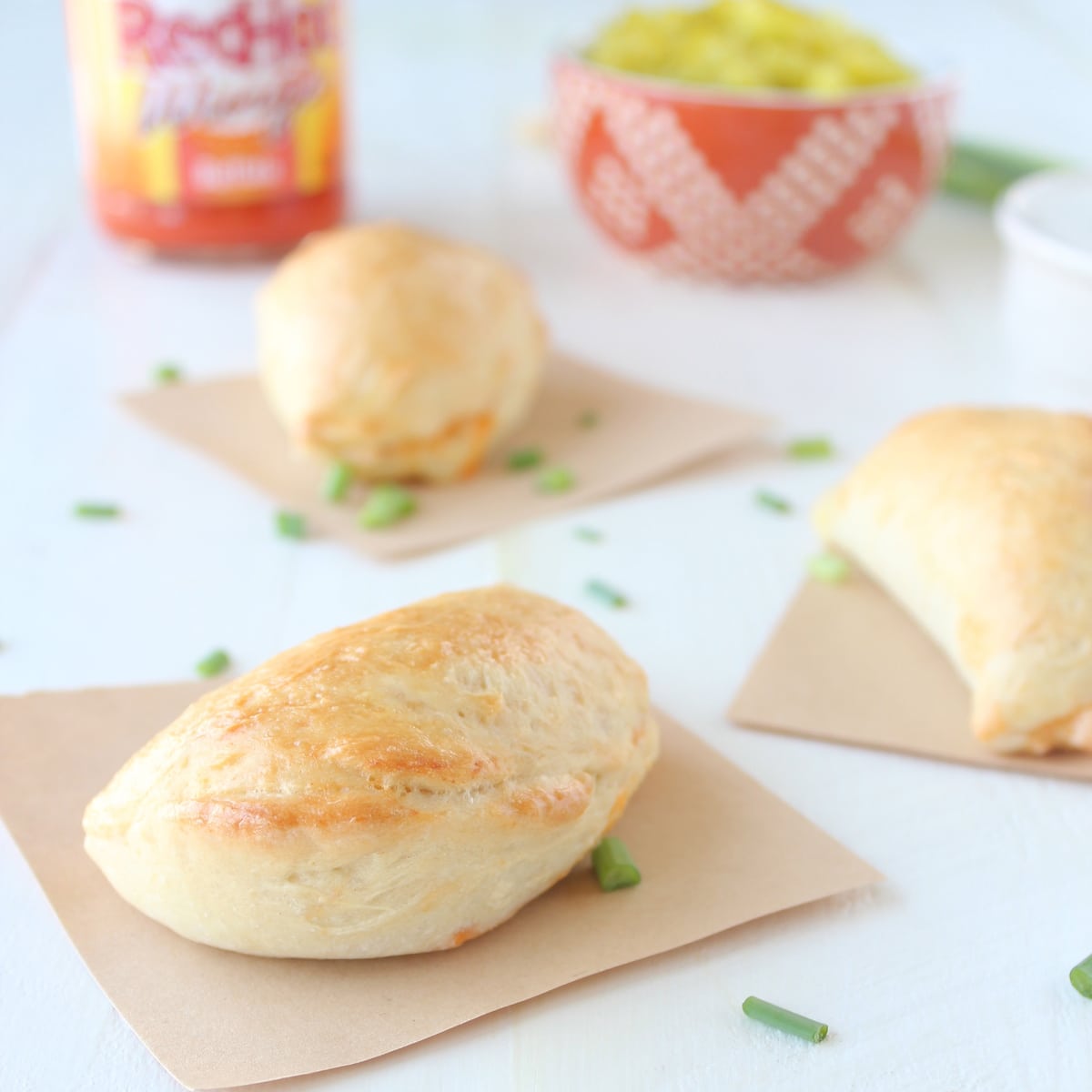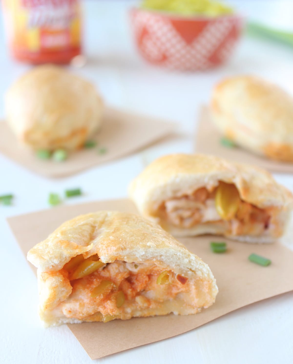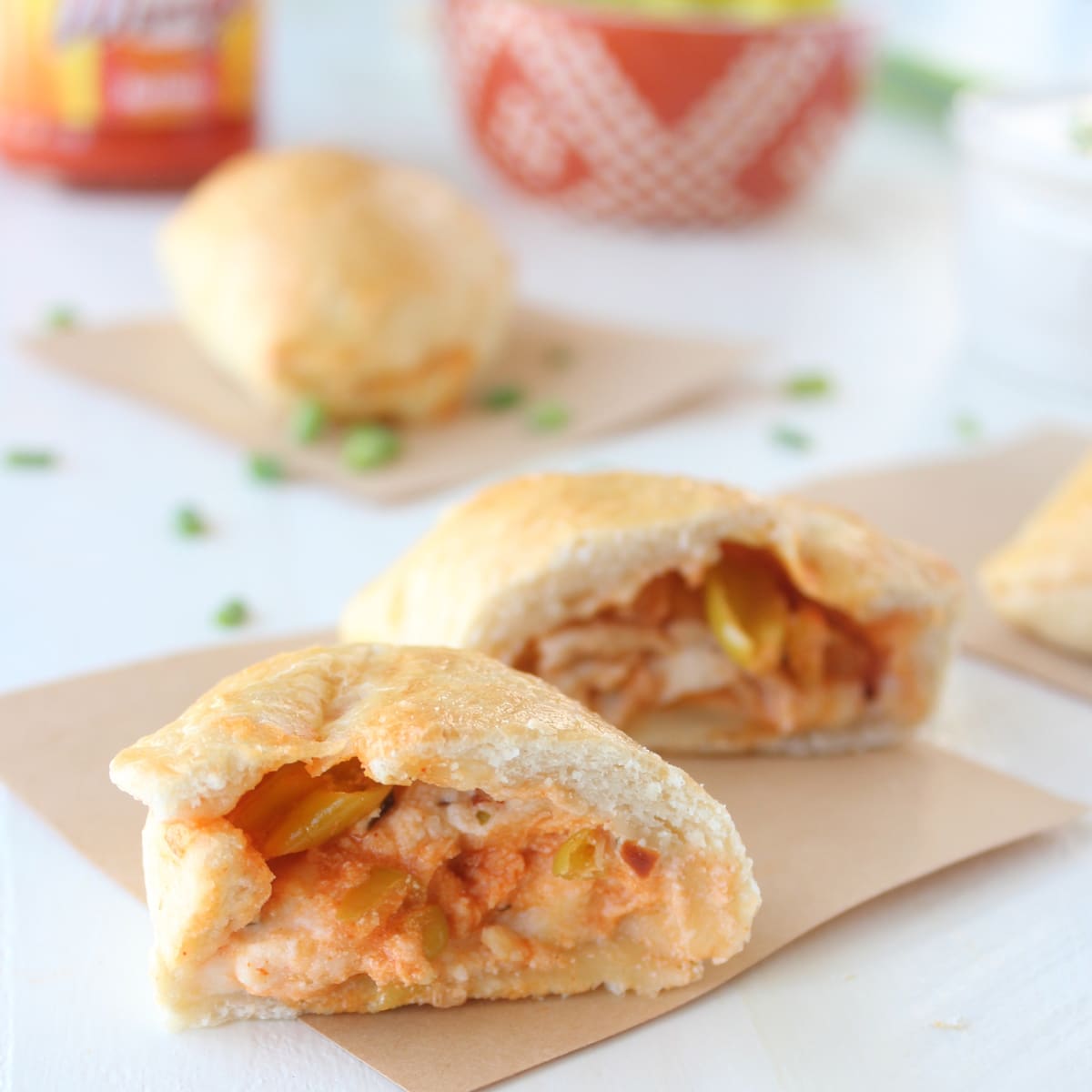 Golden brown pizza dough wrapped around a cheesy, buffalo chicken filling, basically all of my favorite things in delicious appetizer form!